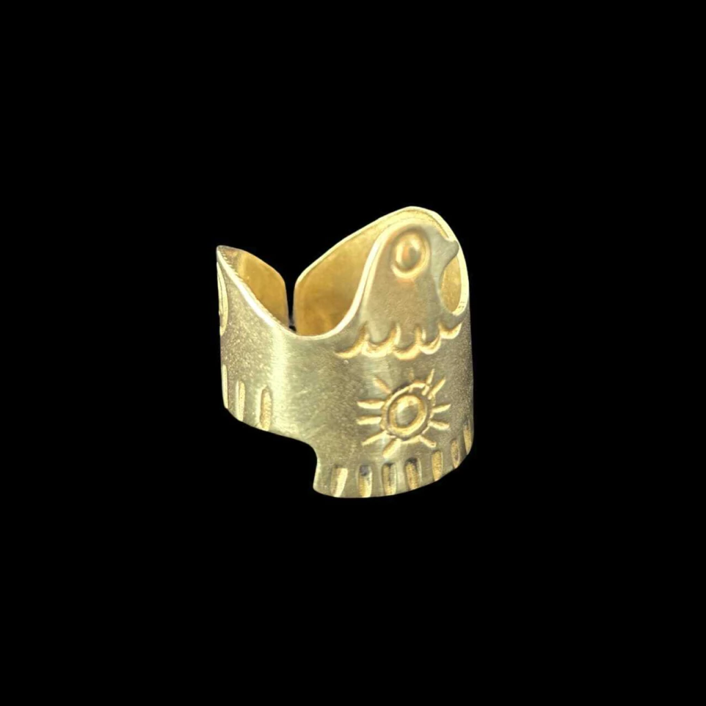 Anel inspirado em uma alta pomba peruana. Aliança aberta para regular. Altura máxima de 2 cm. Peça confeccionada em bronze. Fabricado na Argentina.