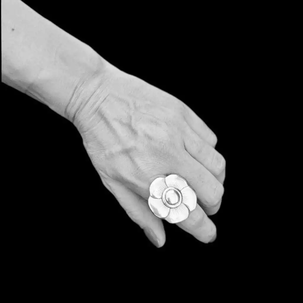 Especial anel com flor de pensamento trabalhada em alto e baixo relevo. Diâmetro de 3 cm. Aliança aberta para ajustar o tamanho! Peça feita de prata baixa. Fabricado e projetado na Argentina.