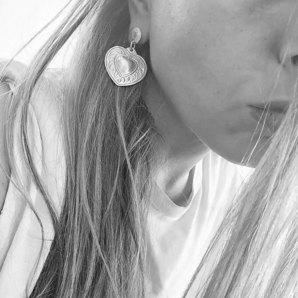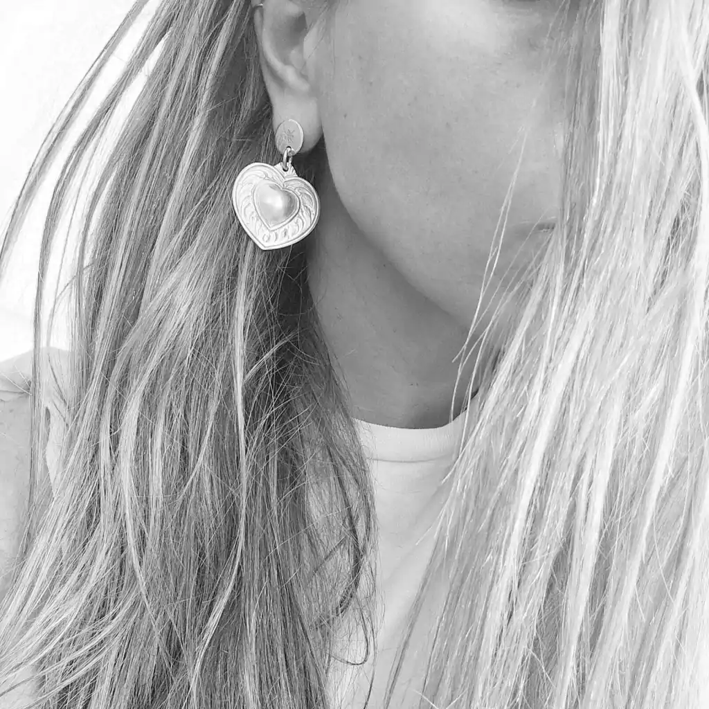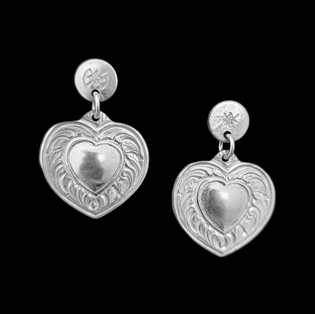 Par de aros médios em forma de coração trabalhados em alto e baixo relevo. Comprimento 4,5cm. Peça feita de prata baixa. Fabricado na Argentina.