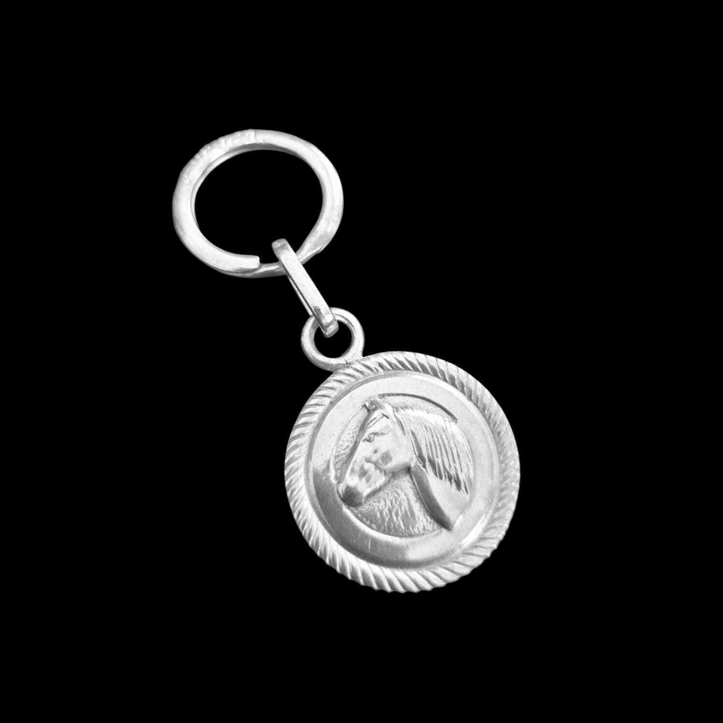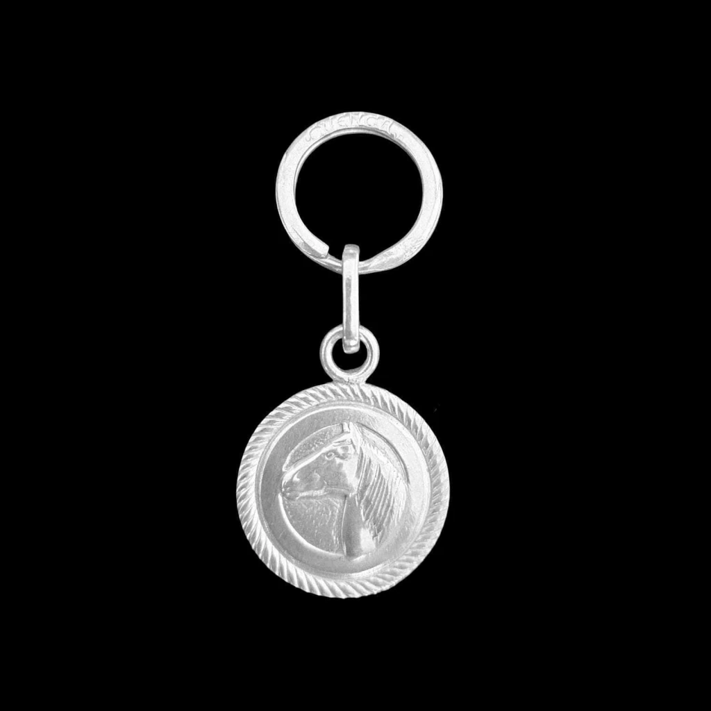 Chaveiro especial de cavalo trabalhado em alto e baixo-relevo, com bordas galonadas (4 cm de diâmetro). Comprimento total de 8,5 cm. Peça feita em prata baixa. Desenhada e fabricada na Argentina.