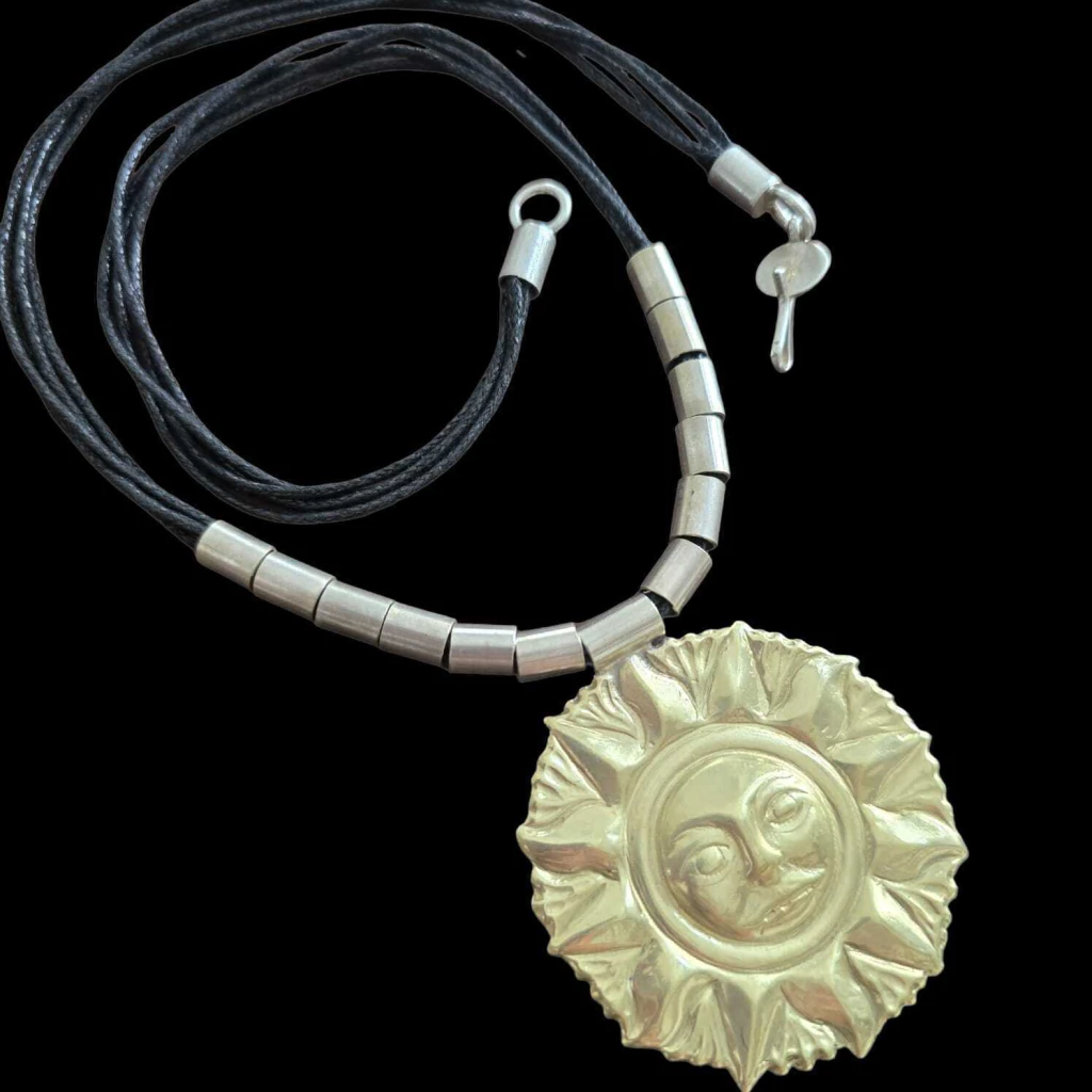 Colar composto por uma estrutura de fio preto com passadores feitos à mão em prata baixa. Acompanha um pingente especial de sol trabalhado em alto e baixo relevo, com 6 cm de diâmetro, feito em bronze. Comprimento total do colar: 65 cm. Produzido em uma combinação de materiais — prata baixa e bronze. Peça desenhada e fabricada na Argentina.
