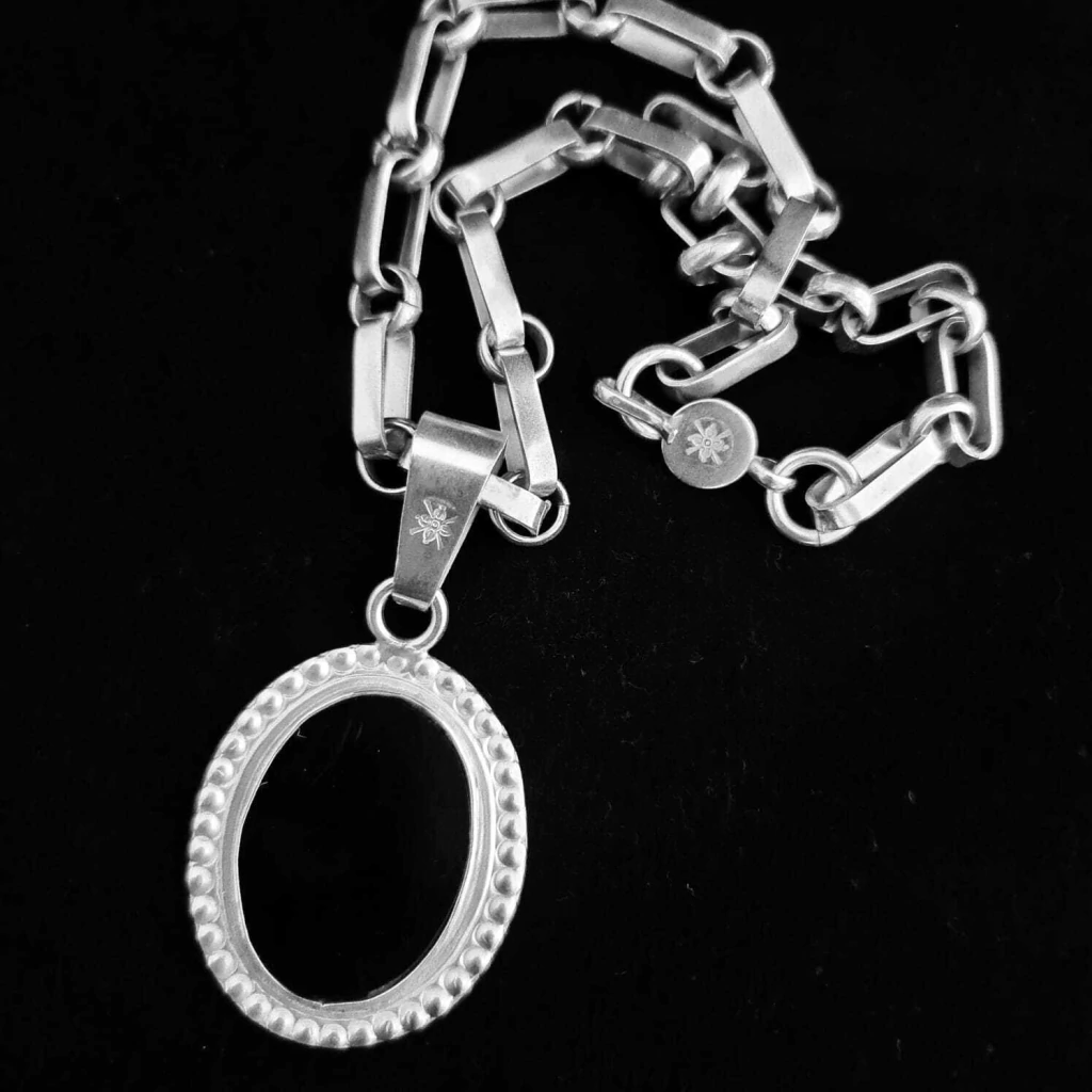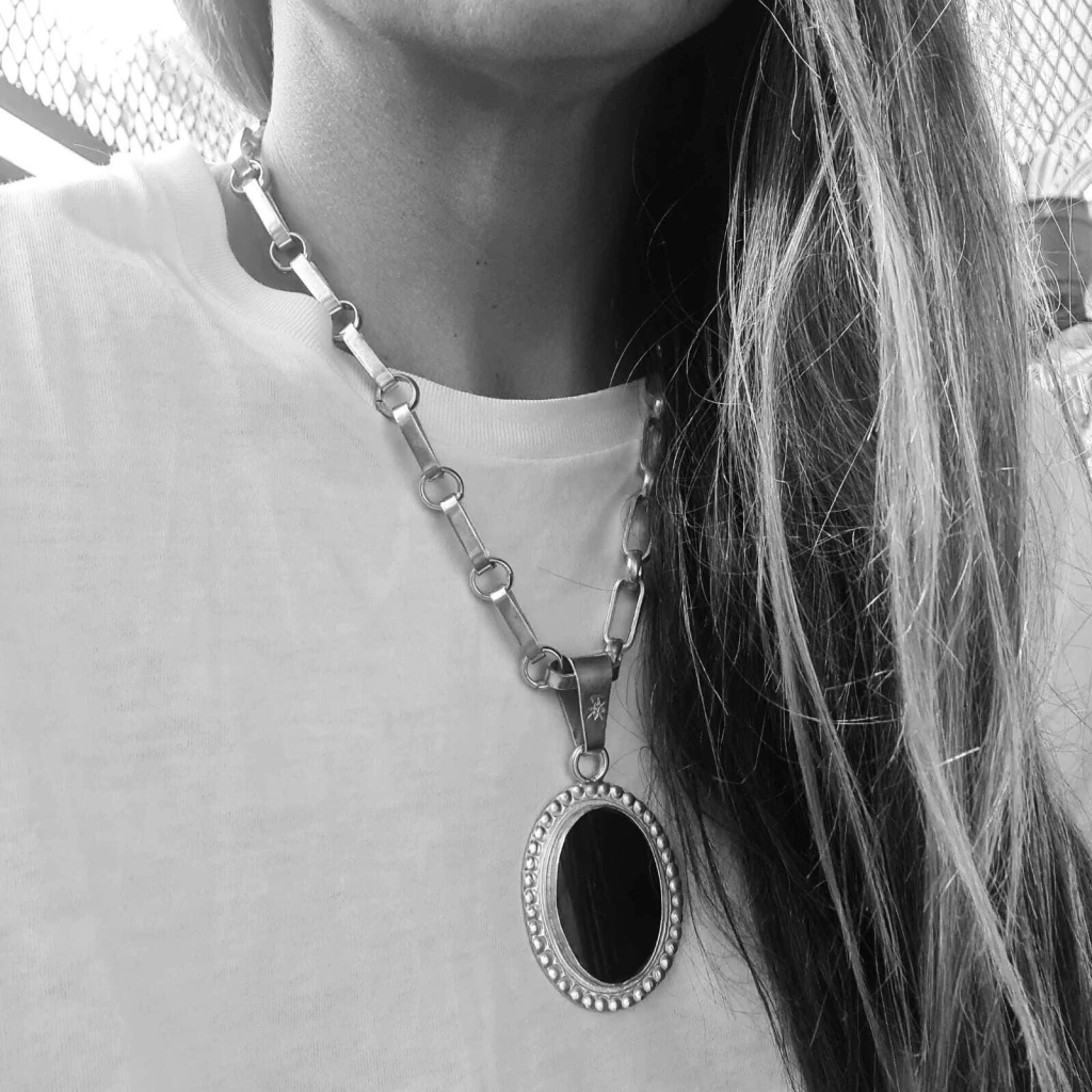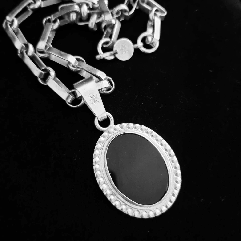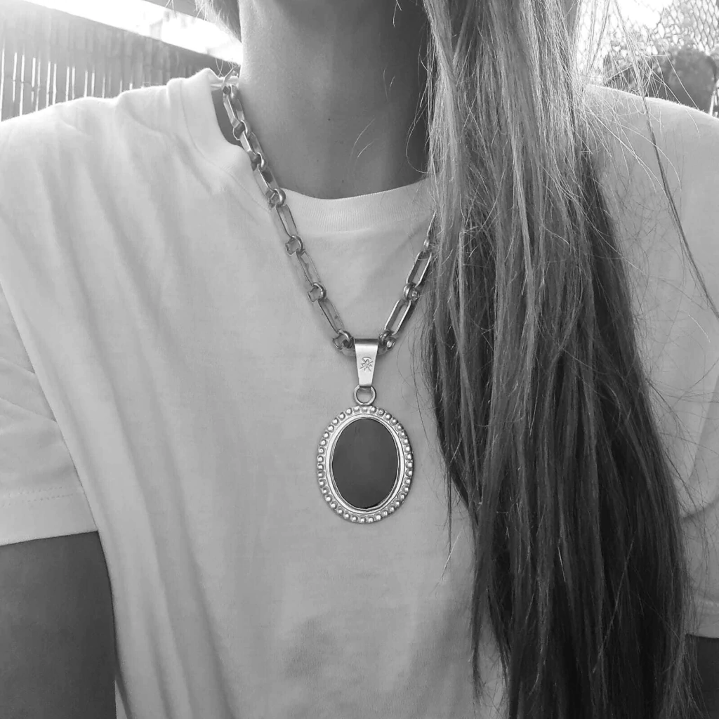 Colar especial com corrente artesanal de 45 cm, acompanhado de pingente oval com detalhes em alto e baixo-relevo nas bordas e resina vegetal preta engastada. Produzido em prata baixa. Projetado e fabricado na Argentina.