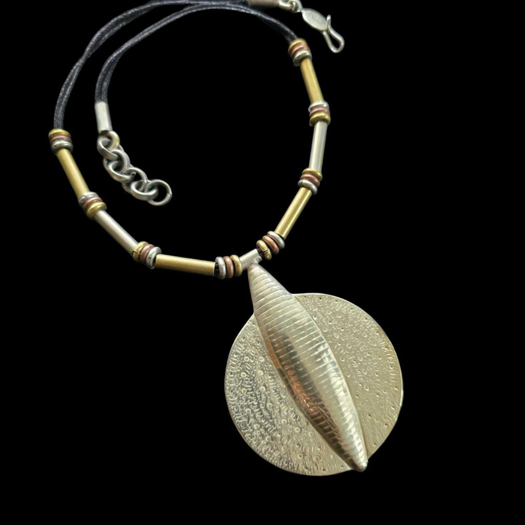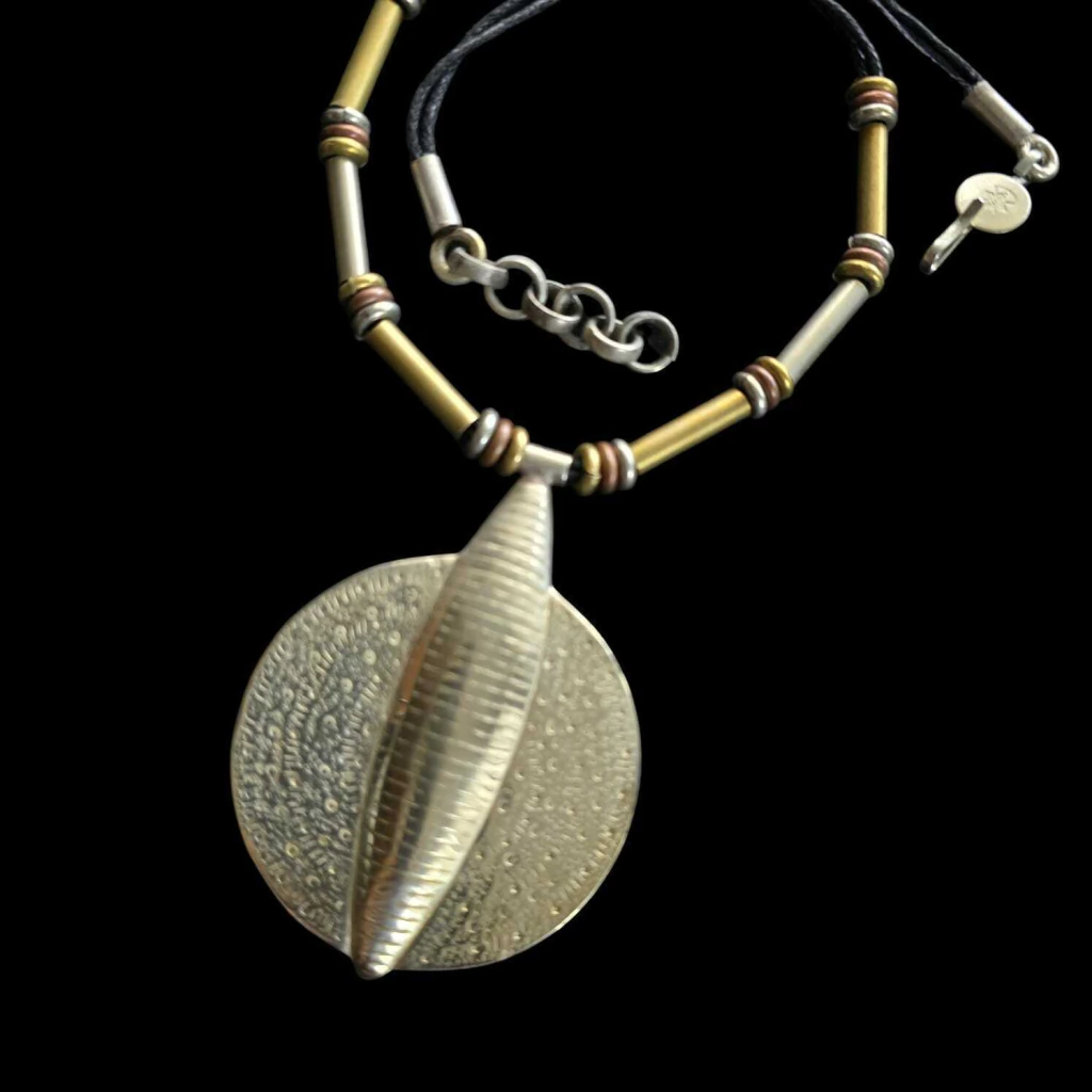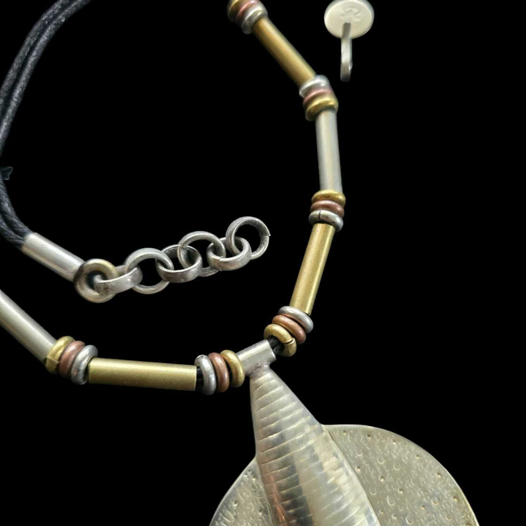 Colar com estrutura de fio preto, adornado com argolas e tubos de diferentes materiais: alpaca, bronze e cobre. Acompanhado de um pingente especial de alpaca, de 8 cm x 6 cm, trabalhado em alto e baixo relevo. Comprimento de 53 cm. Fabricado e desenhado na Argentina.