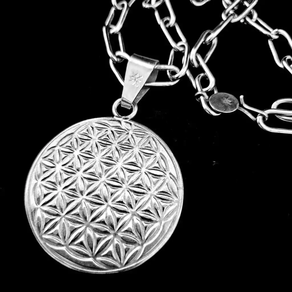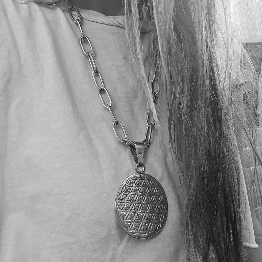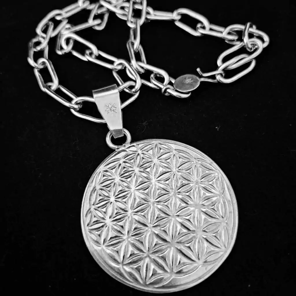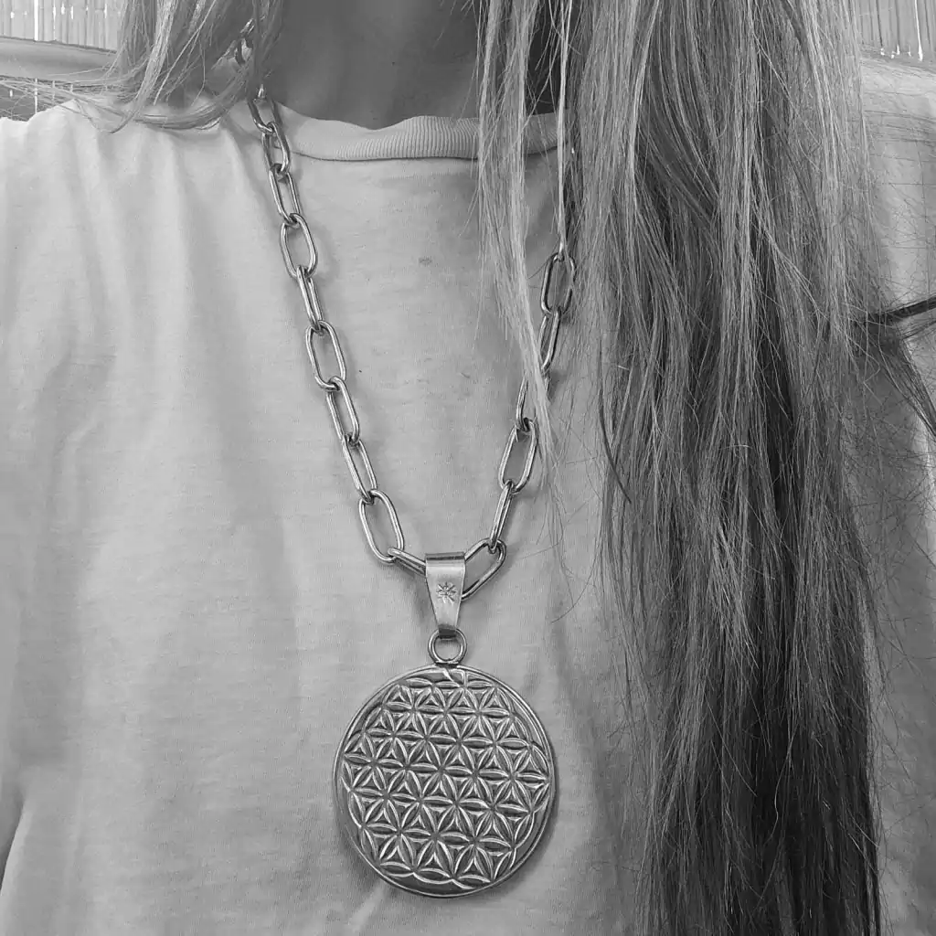 Colar composto por uma corrente artesanal de 60 cm de comprimento e um pingente circular trabalhado em alto e baixo relevo de 6 cm de diâmetro. Peça feita de prata baixa. Tupambae: Terra de Deus (Guarani). Fabricado na Argentina.