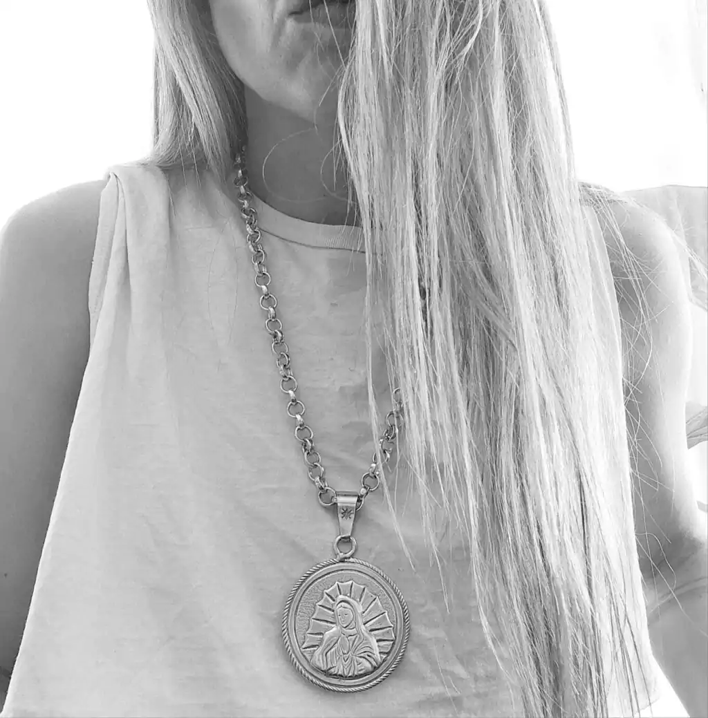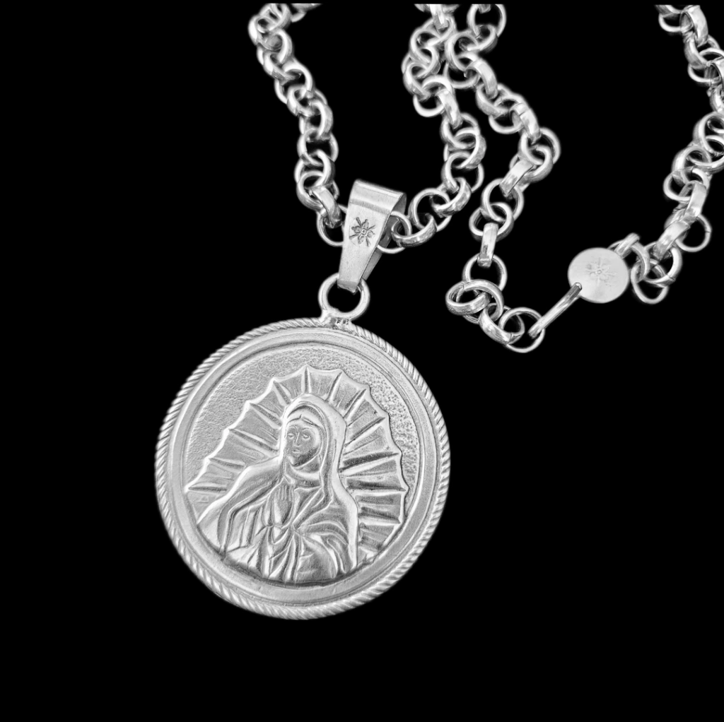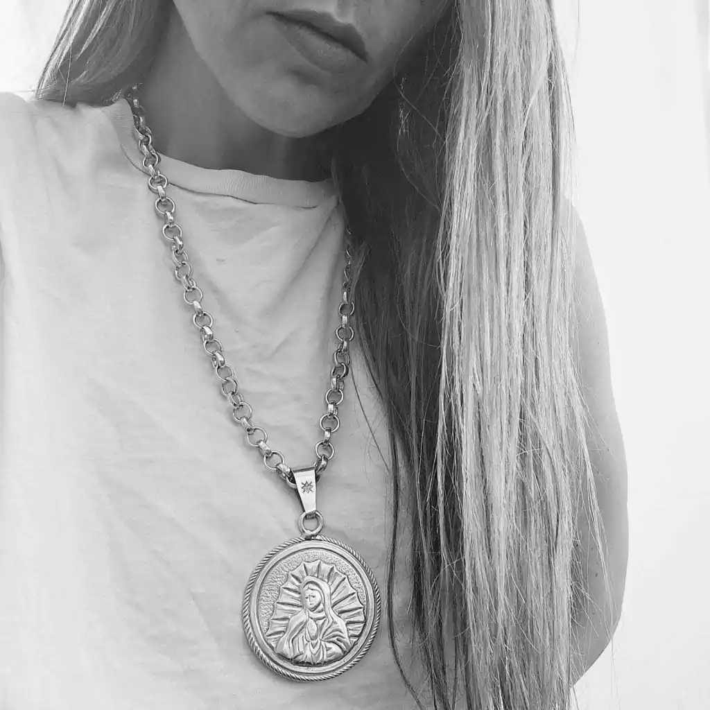Colar composto por uma corrente de 60 cm e um grande pingente com o motivo da Virgem de Guadalupe feito em alto e baixo relevo. Diâmetro do pingente 6 cm e comprimento total do pendente 8,5 cm. Peça em prata baixa. Fabricado na Argentina.