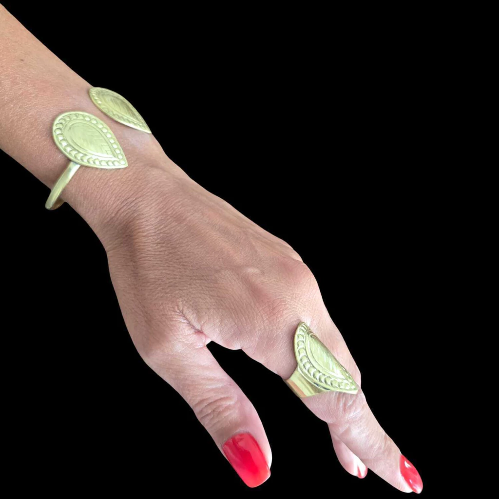 Pulseira de meia cana com pontas em forma de folha trabalhadas a cinzel, medindo 3 cm x 2 cm. Aberta para ajustar a medida. Peça realizada em bronze. Projetada e fabricada na Argentina.
