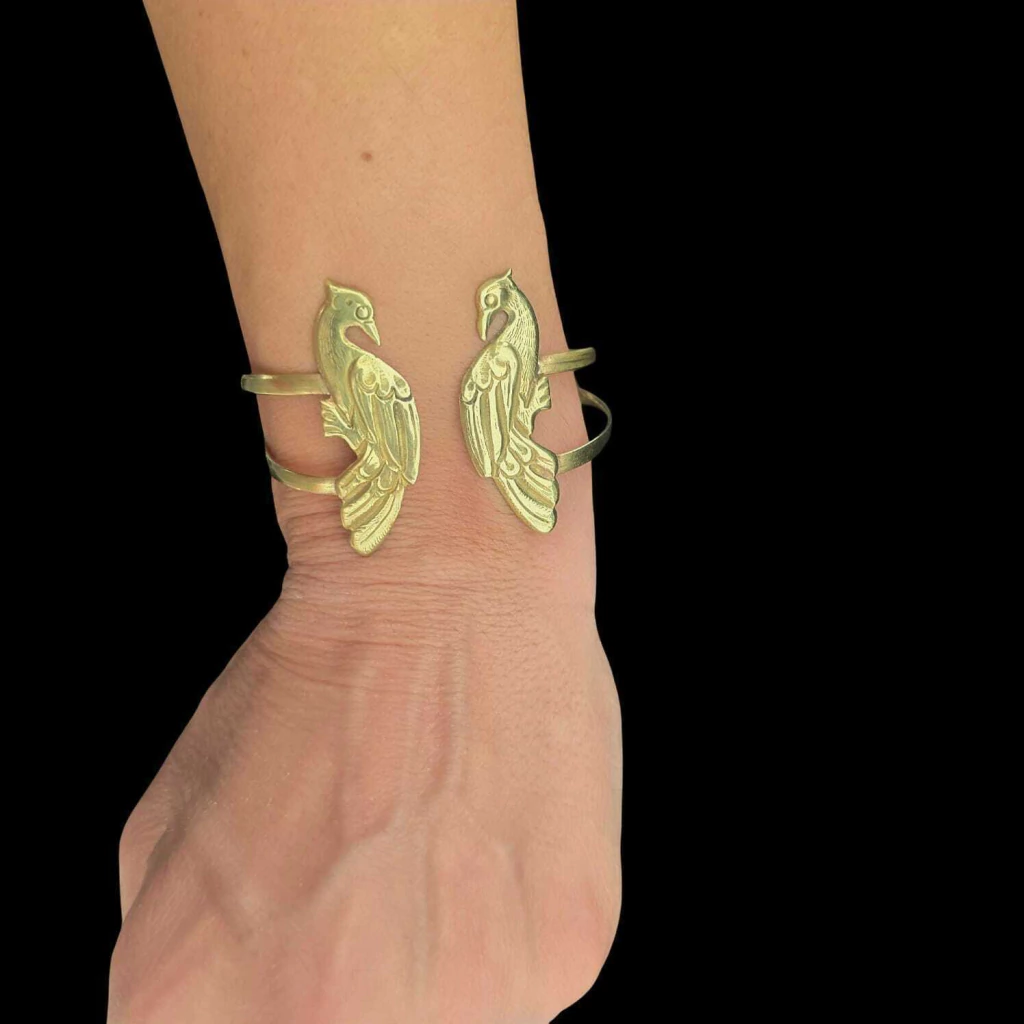 Especial bracelete de dupla meia-cana com ponteiras de aves imponentes, trabalhadas em alto e baixo relevo, largura de 4 cm x 1,5 cm. Peça feita em bronze. Desenhado e fabricado na Argentina. Kuarasi: Sol na língua Guarani.