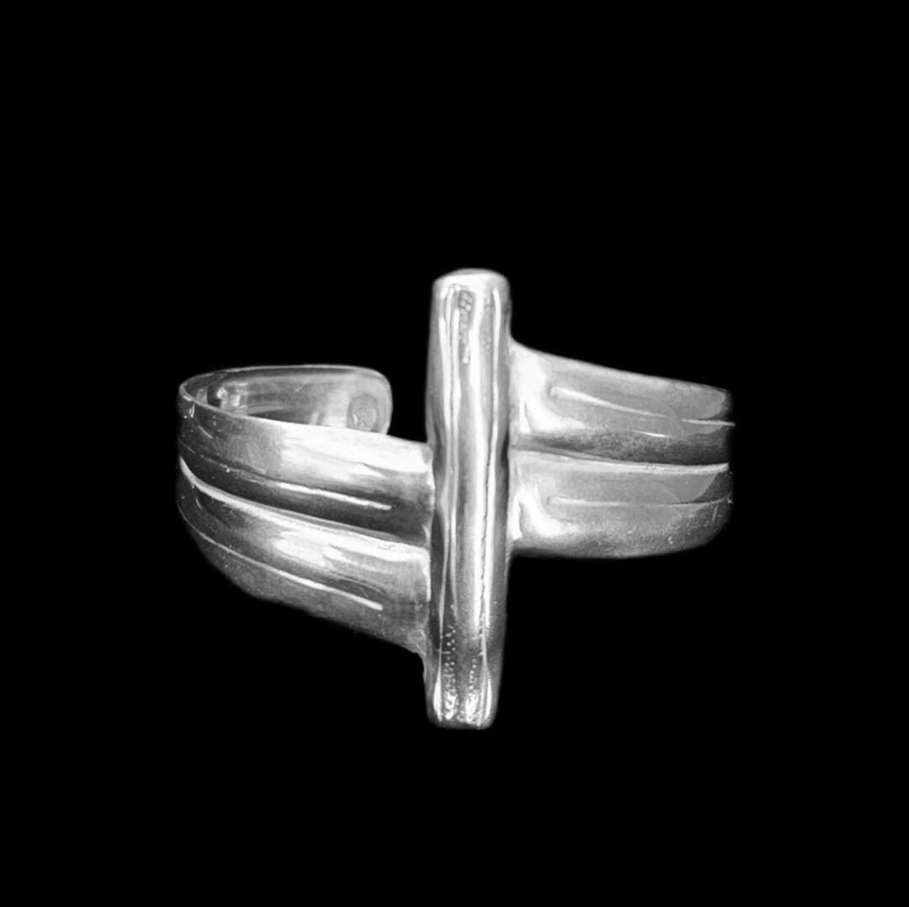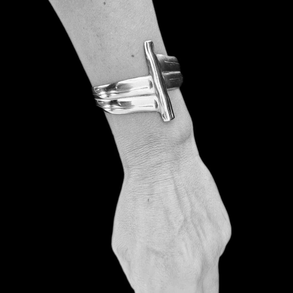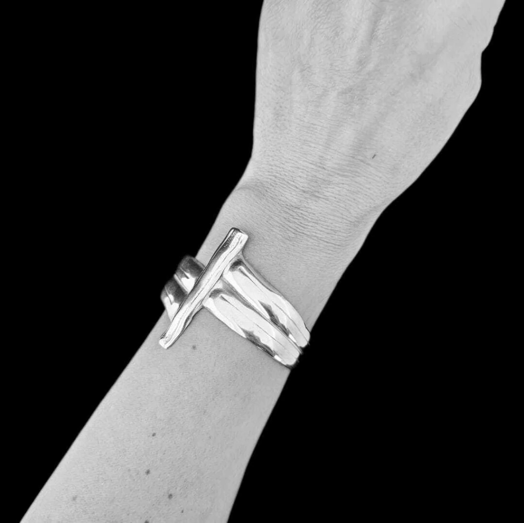 Pulseira especial trabalhada em alto e baixo-relevo. Altura: 5 cm. Pulseira aberta para ajustar a medida! Peça feita em prata baixa. Projetada e fabricada na Argentina.