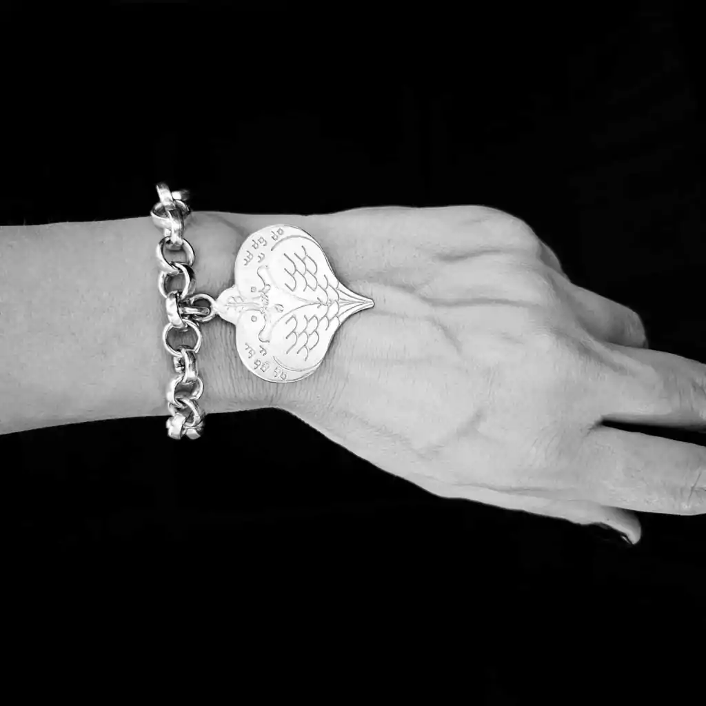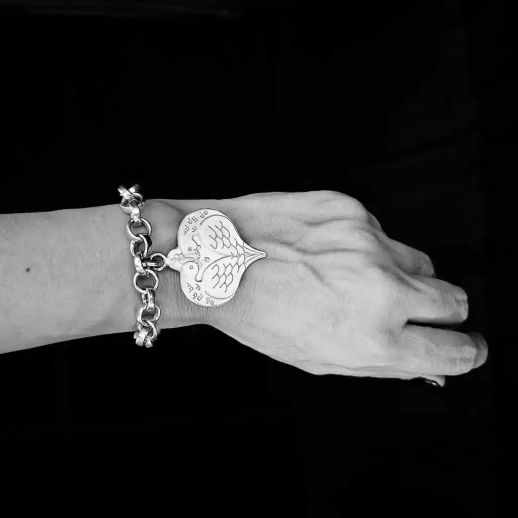 Pulseira articulada artesanal de 23cm de comprimento e especial pingente de pássaro cinzelado (4cm x 4 cm). Peça feita de prata baixa. Sapucaí: Um grito de guerra longo ou agudo, um sinal de júbilo. Fabricada na Argentina.