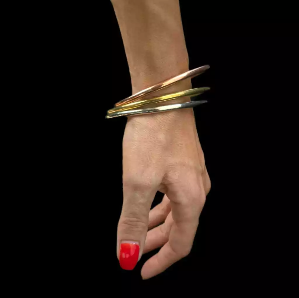 Conjunto de três pulseiras circulares, 7 cm de diâmetro. Cada pulseira é feita de um material diferente: alpaca, bronze e cobre.