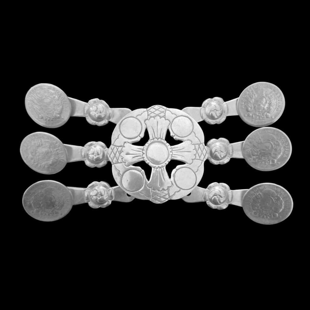 Rastra especial com centro de cruz pampa vazada de 8 cm de diâmetro e tiras de costelas cinzeladas com moedas de "patacones" ou "carolos" (4 cm de diâmetro). Comprimento total de 22,5 cm. Peça feita em prata baixa. Desenhada e fabricada na Argentina.