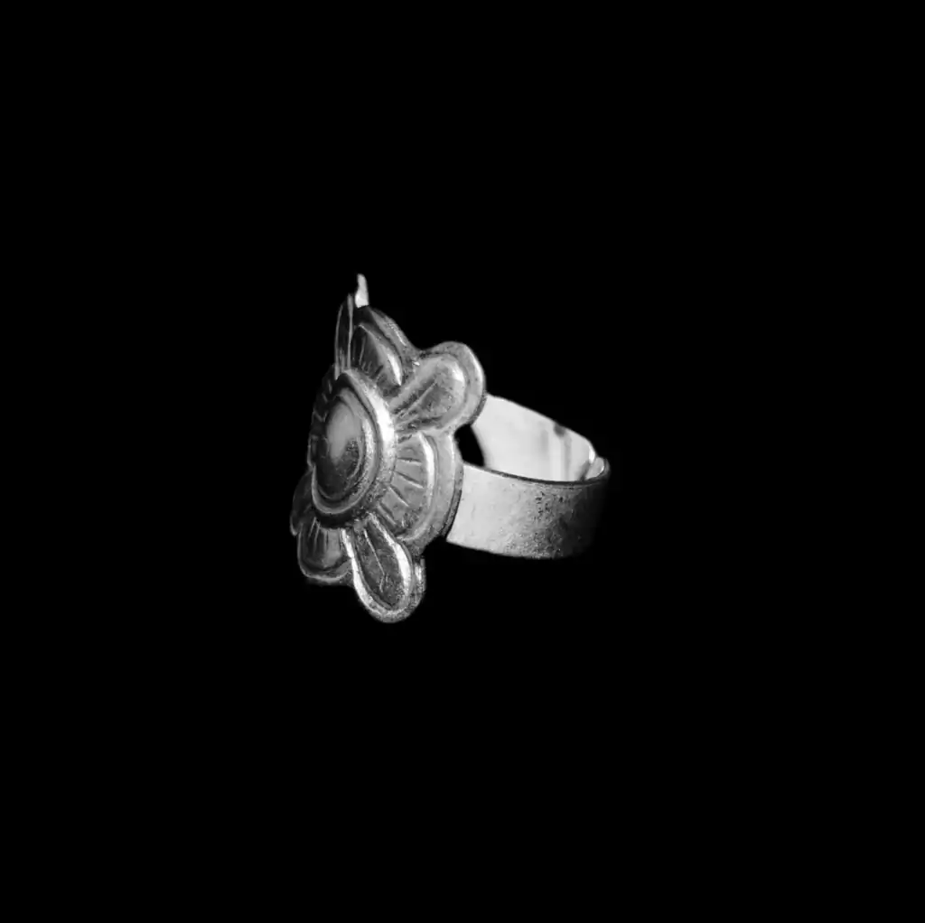 Anillo tipo alianza regulable con centro cuadrado y detalles a cincel de 2cm por 2cm. Alianza abierta para poder regular su medida. Pieza de plata baja.