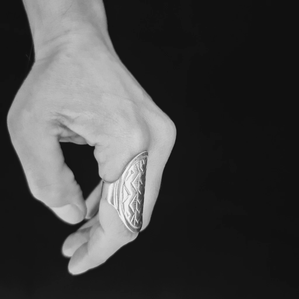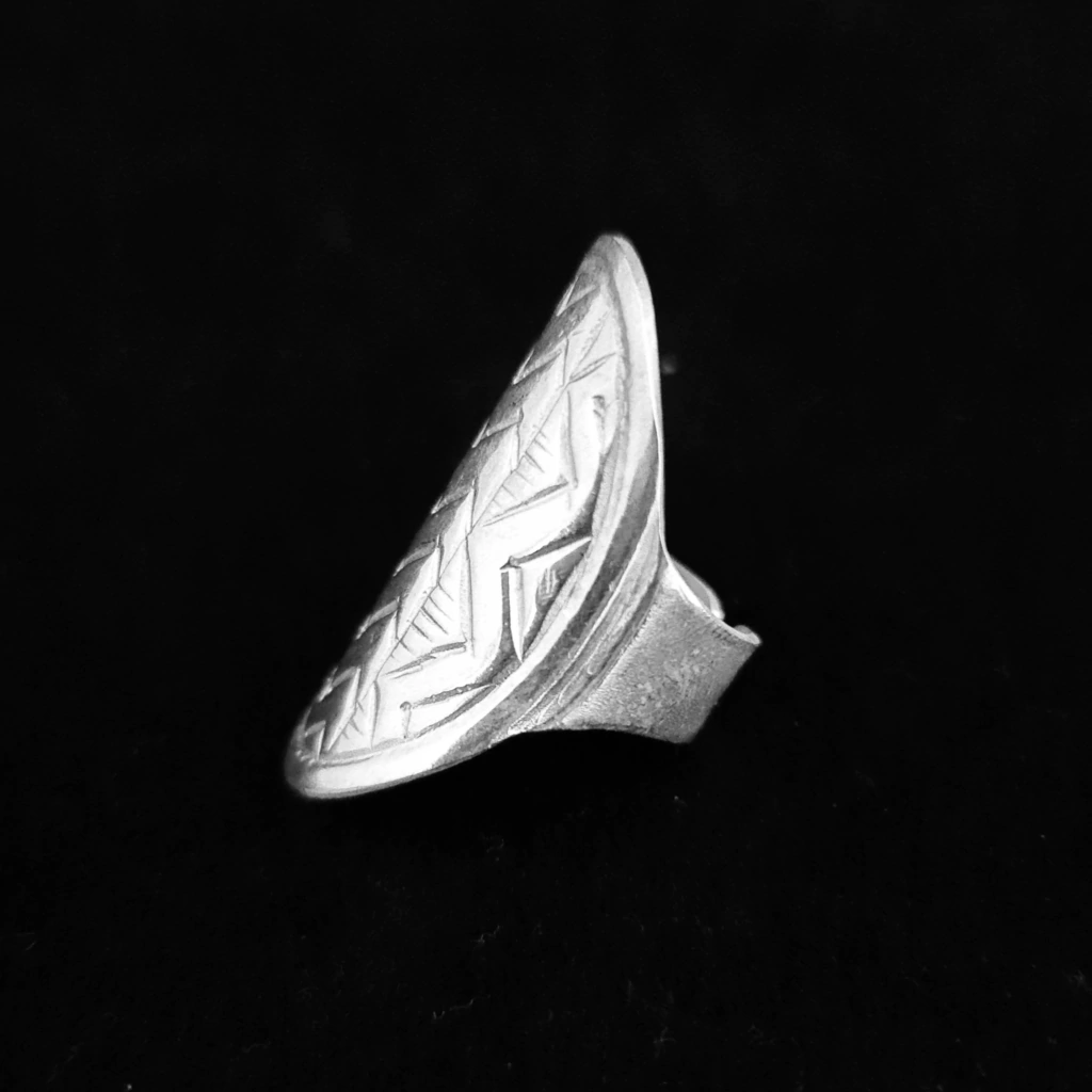 Especial anillo ovalado con líneas geométricas cinceladas. Largo total de 3,5 cm. Alianza abierta para poder regular su medidas! Pieza realizada en plata baja. Diseñado y fabricado en Argentina.