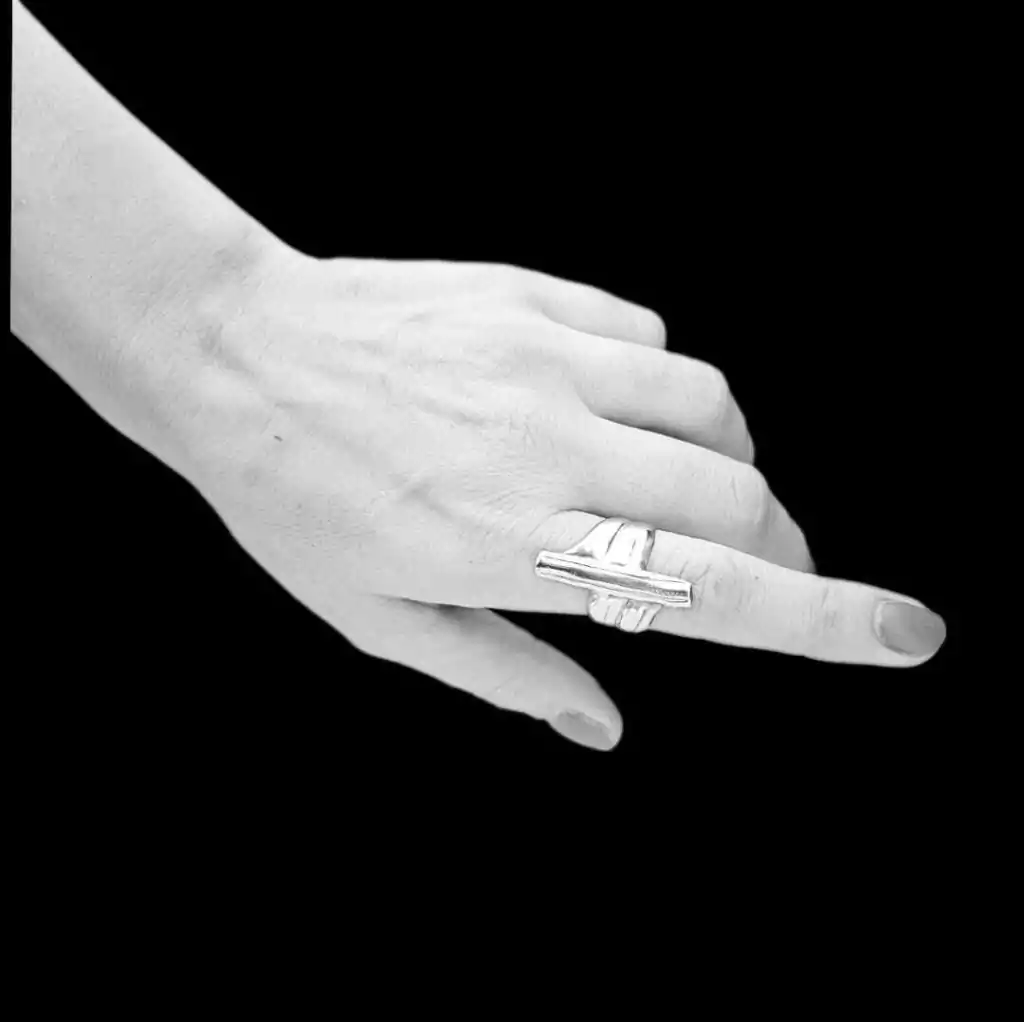 Especial anillo trabajado en alto y bajo relieve. Alto de 3cm. Alianza abierta para poder regular su medida! Pieza realizada en plata baja. Diseñado y fabricado en Argentina.