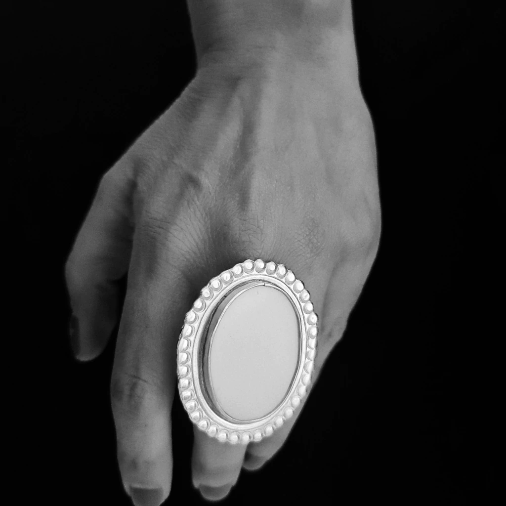 Especial anillo ovalado trabajado en alto y bajo relieve en sus bordes y resina vegetal color cruda engarzada. Medidas: 5 cm x 4 cm. Alianza abierta para poder regular su medida. Pieza realizada en plata baja. Diseñado y fabricado en Argentina.