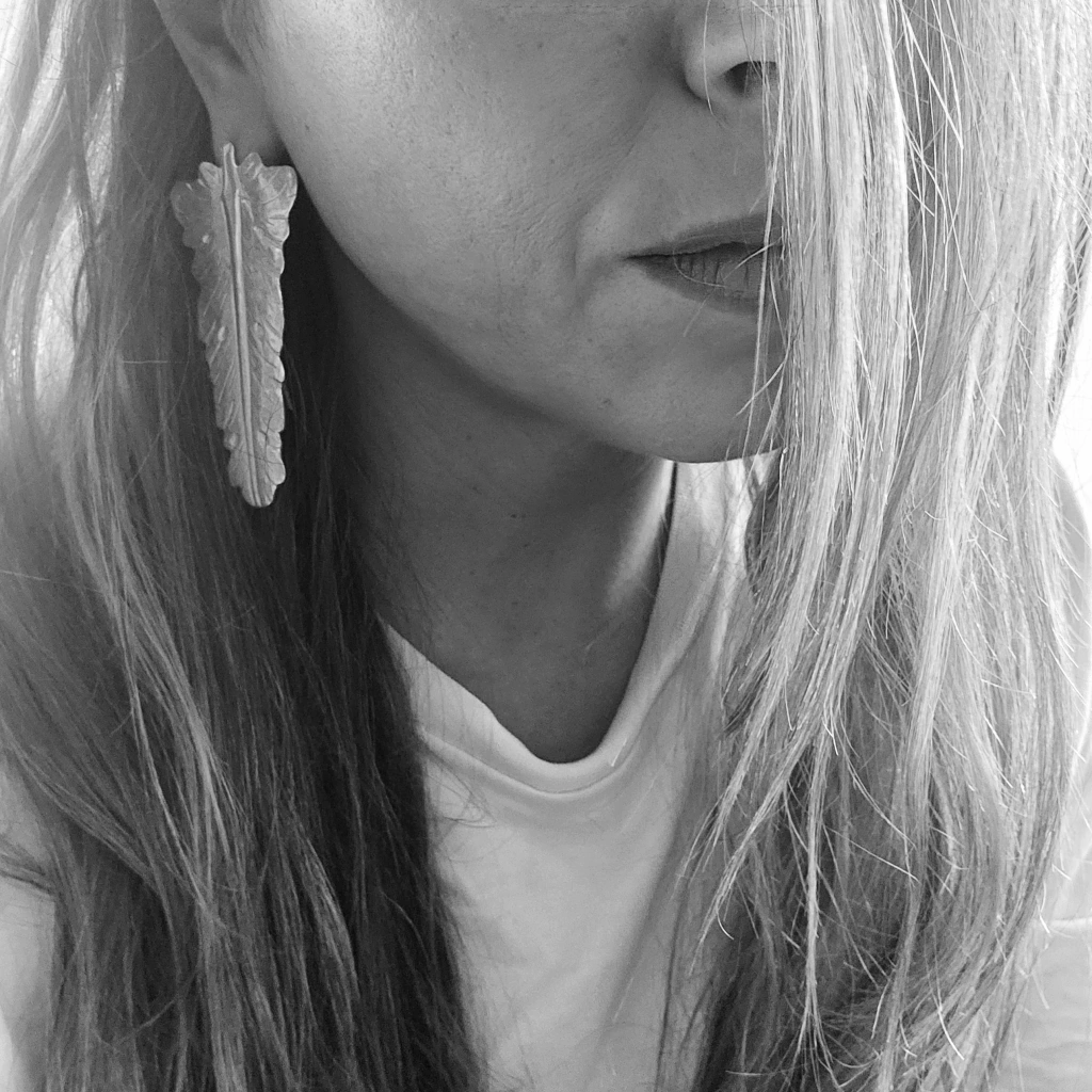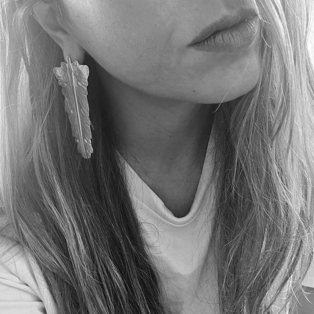 Par de aros alargados en forma de hoja de 6 cm de largo. Trabajado en alto y bajo relieve. Realizado en plata baja. Fabricados y diseñados en Argentina.