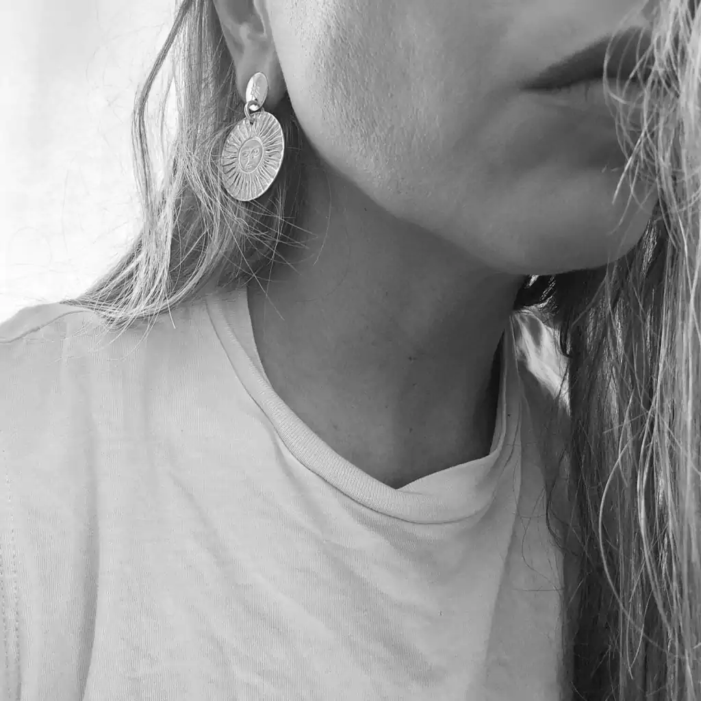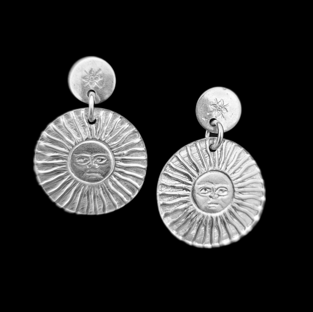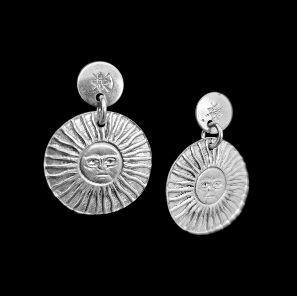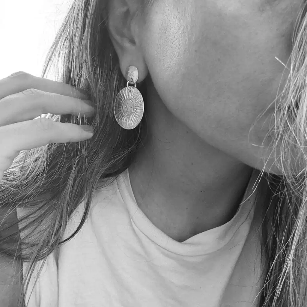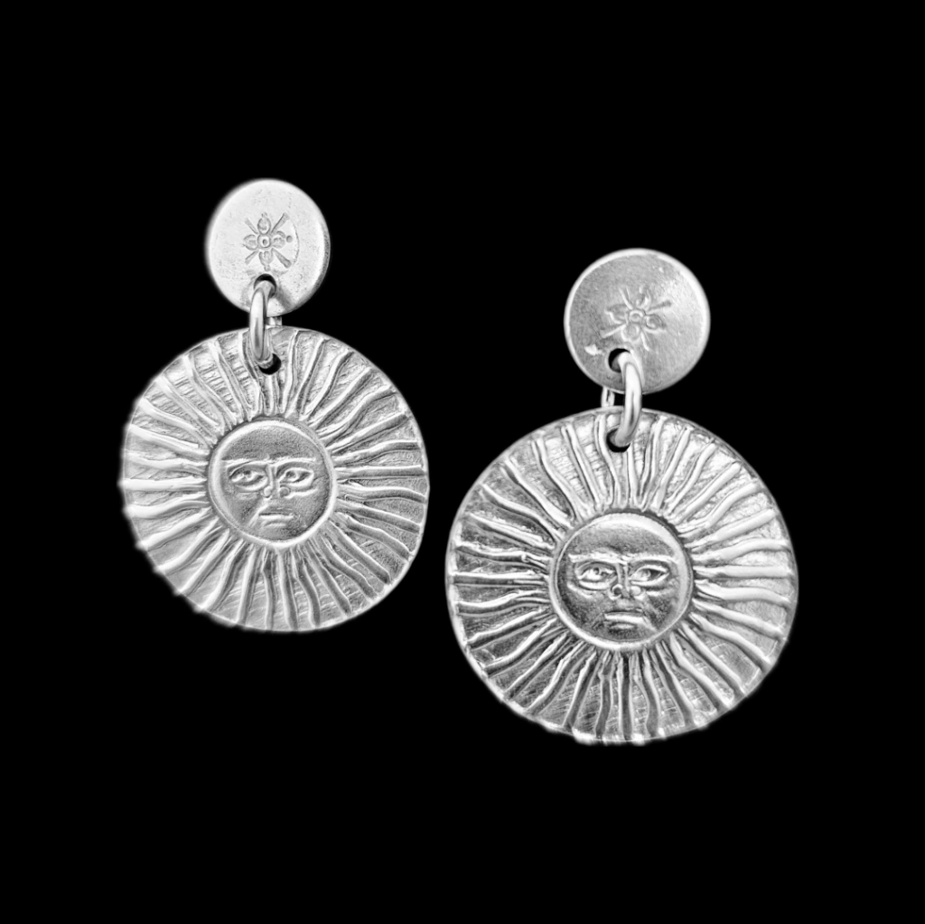 Par de aros medianos del sol Inti trabajados en alto y bajo relieve. Largo total de 4 cm. Pieza realizada en plata baja. Fabricados y diseñados en Argentina.