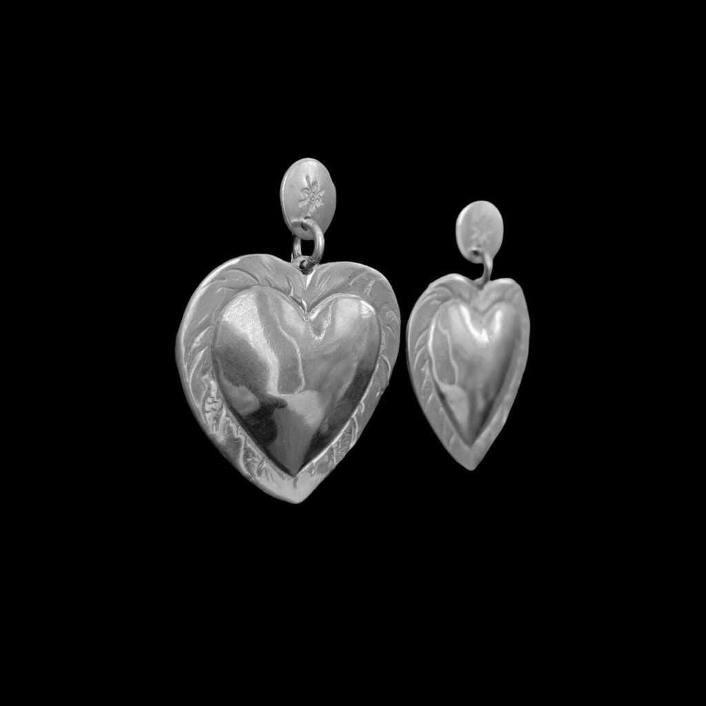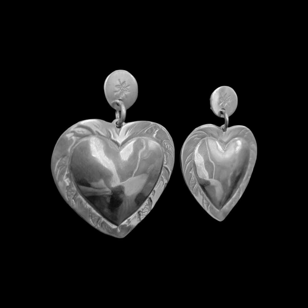 Par de aros medianos con especiales corazones cincelados en sus bordes de 4 cm x 4 cm. Largo total de 5 cm. Pieza realizada en plata baja. Kuyen: luna o color de luna en lengua Mapudungun.