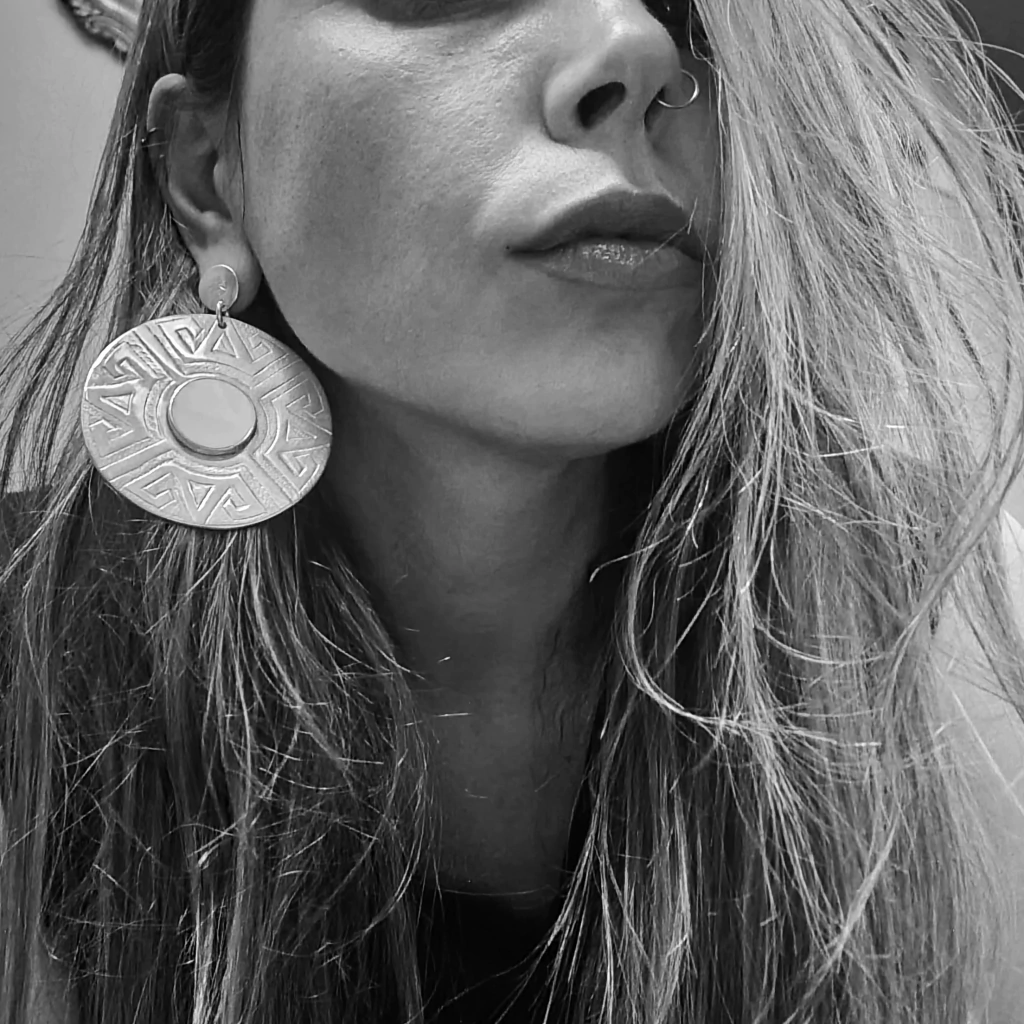 Par de aros grandes con especial dije cincelado y centro de resina vegetal color crudo. Diámetro del dije 6 cm. Largo total del aro 7 cm. Pieza de plata baja. Inspiración Amerindia. Fabricados y diseñados en Argentina.