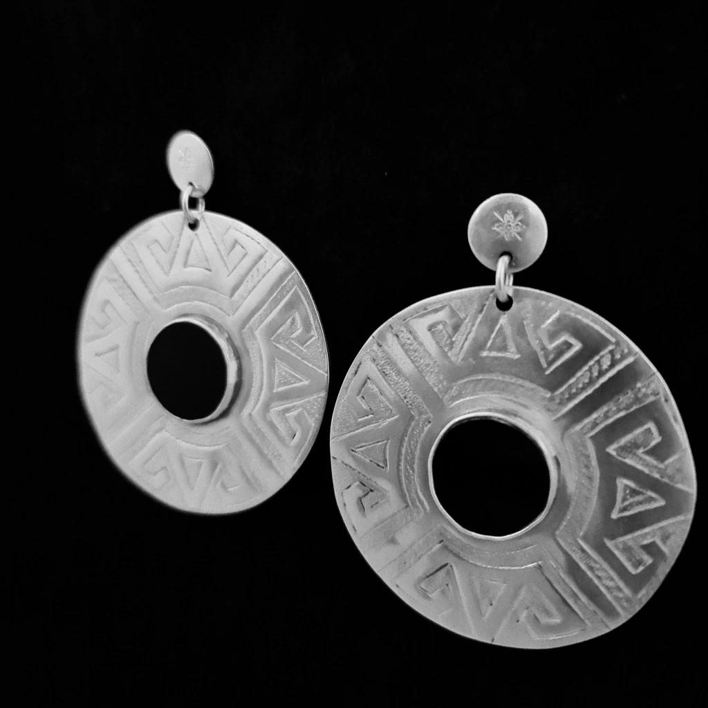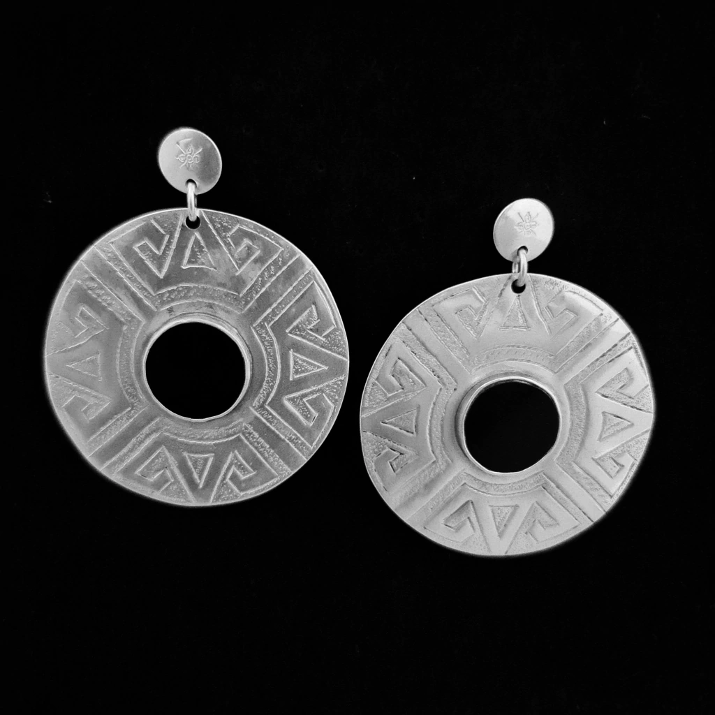 Par de aros grandes con especial dije cincelado y centro de resina vegetal color negro. Diámetro del dije 6 cm. Largo total del aro 7 cm. Pieza de plata baja. Inspiración Amerindia. Fabricados y diseñados en Argentina.