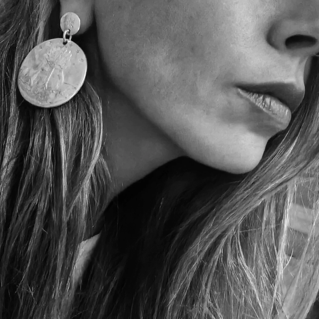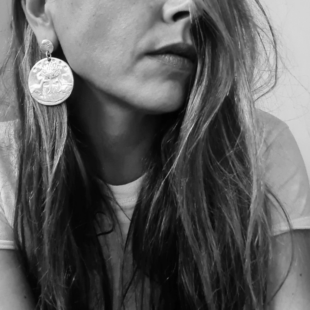 Par de aros medianos trabajados en alto y bajo relieve del árbol de la vida. Diámetro de 4 cm. Largo total de 5 cm. Pieza realizada en plata baja. Fabricados y diseñados en Argentina.