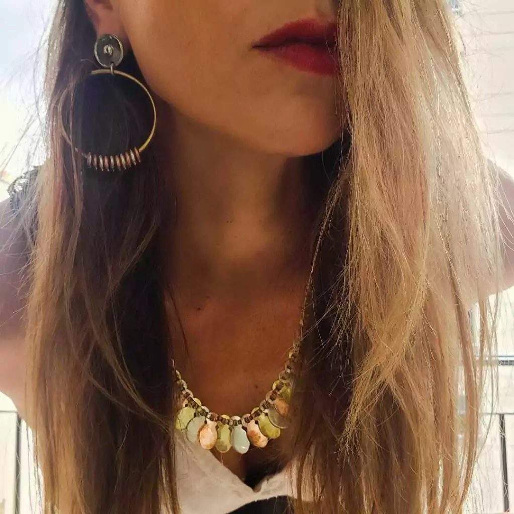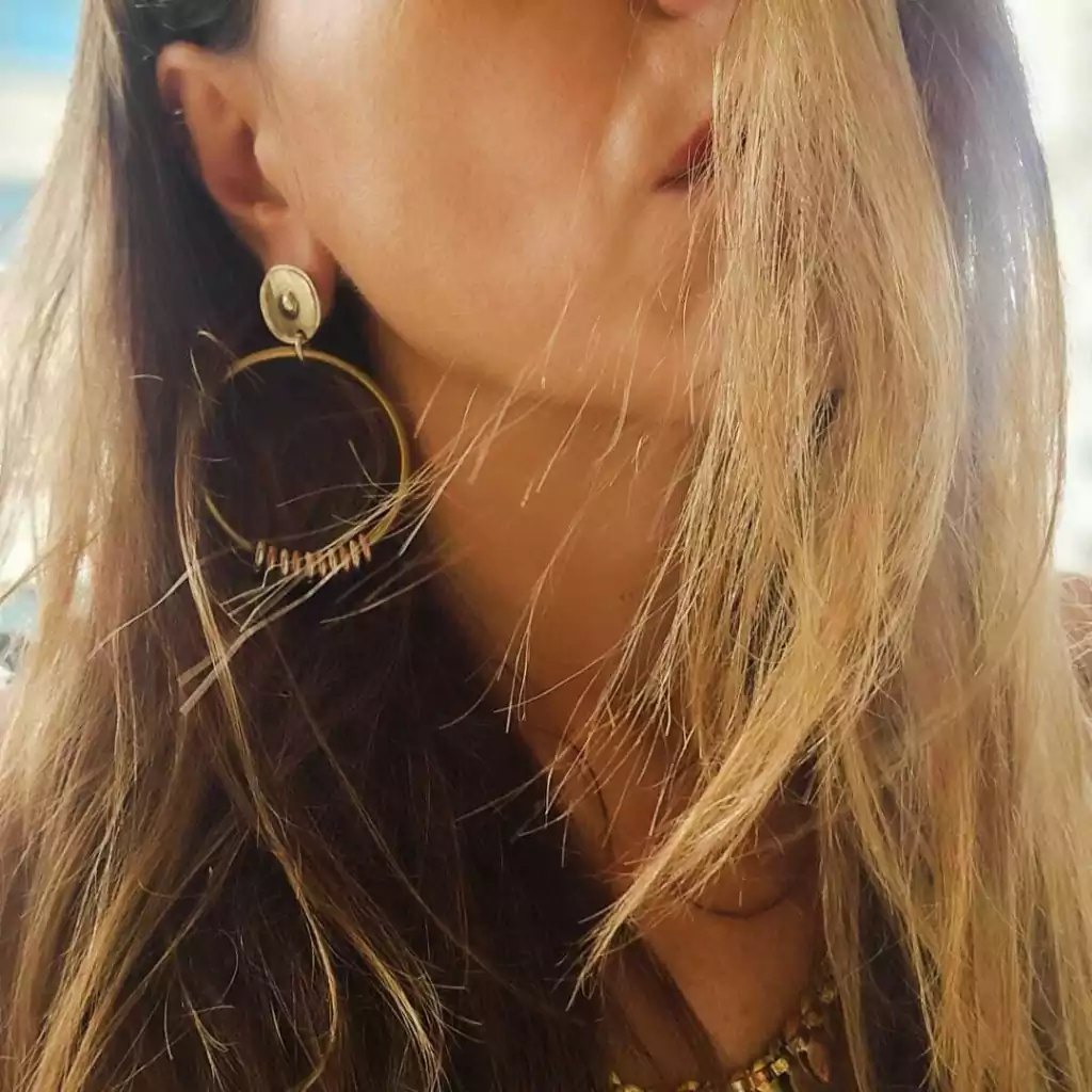 Par de aros medianos de argolla de bronce de 5 cm de diámetro intervenida de argollitas de alpaca y cobre. Especial lóbulo de alpaca de 1,5 cm.