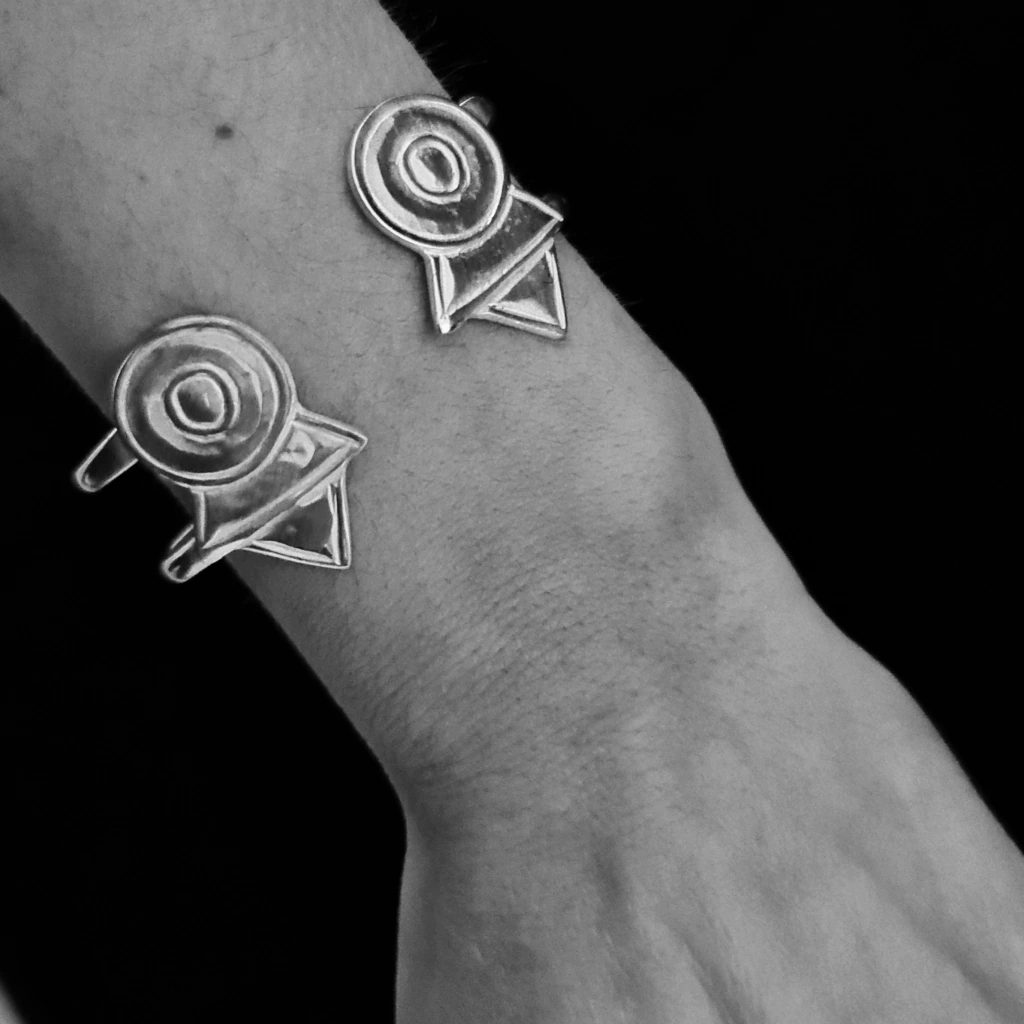 Pulsera tipo esclava con especiales punteras cinceladas de 3 cm cada una. Pieza de plata baja. Diseñada y fabricada en Argentina.