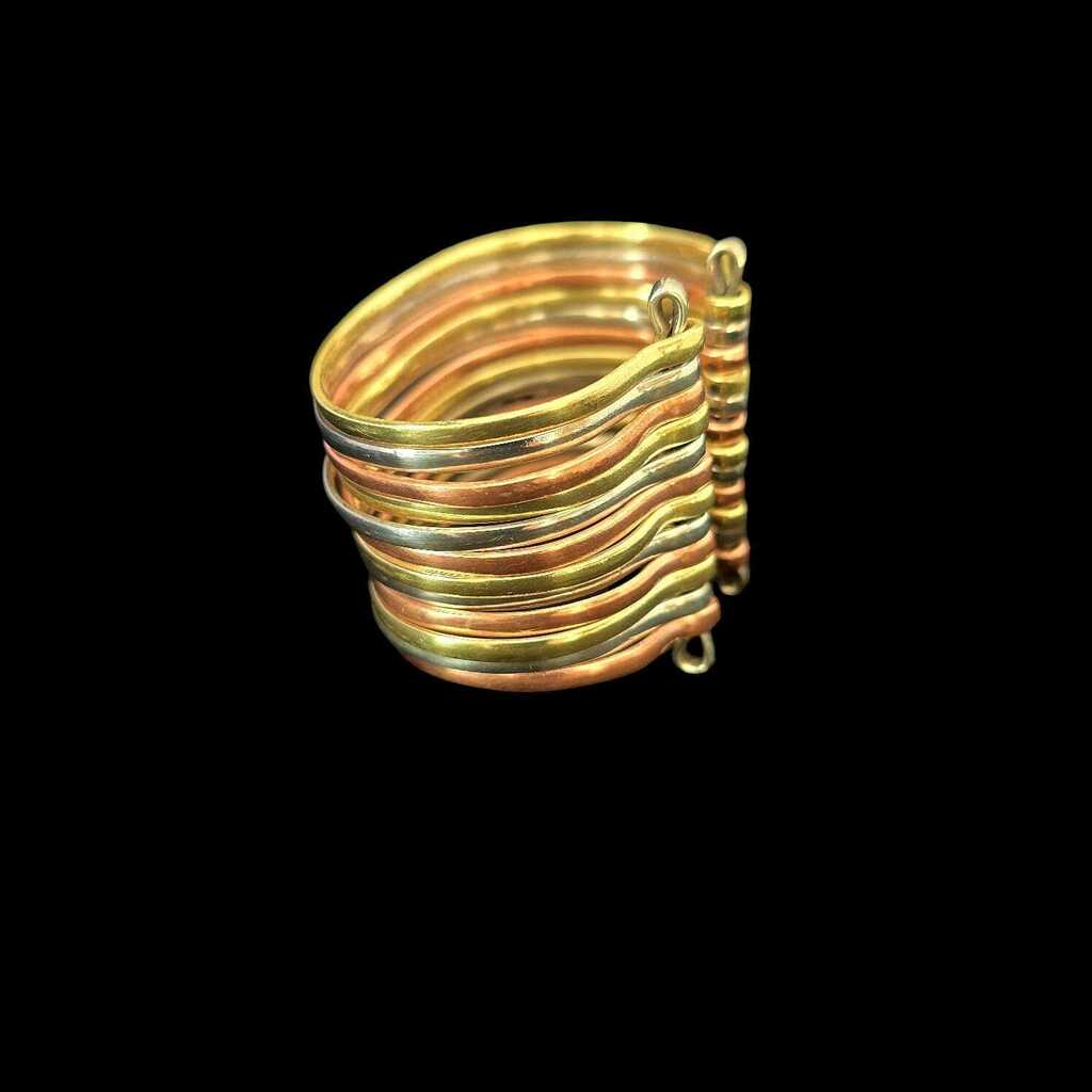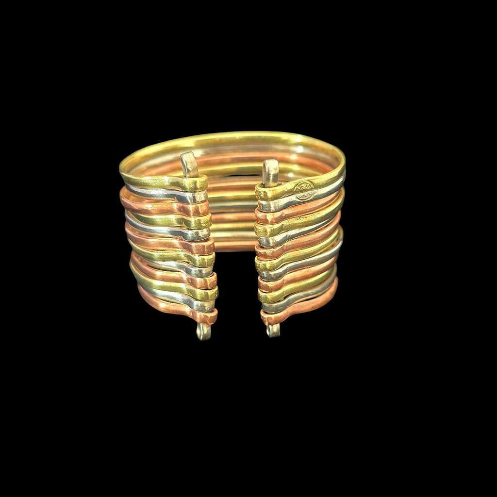 Importante esclava íntegramente realizada a mano. Ancho total de 4 cm. Pieza de materiales combinados: alpaca, bronce y cobre. Fabricada y diseñada en Argentina. Chacay: puente en lengua Quechua