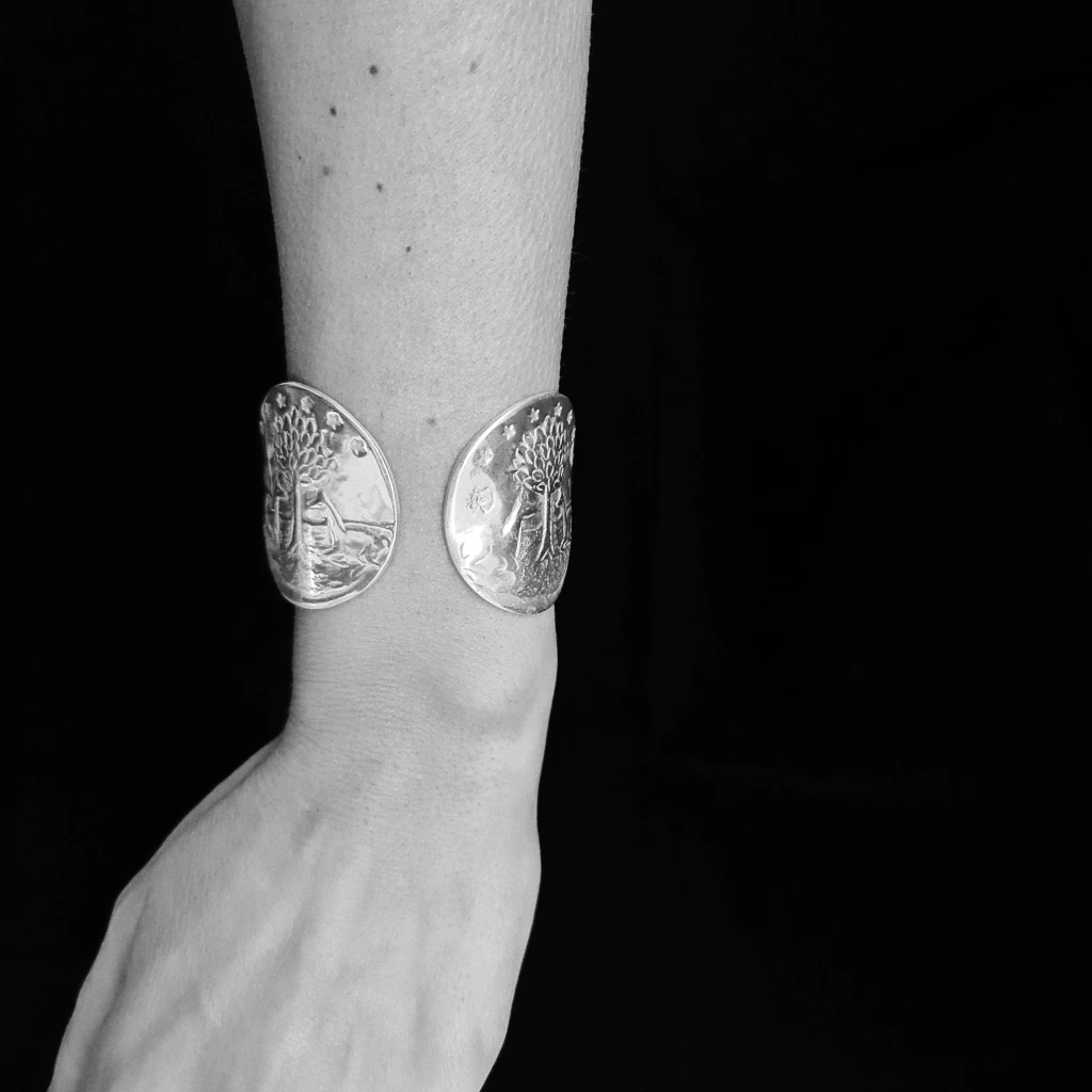 Brazalete con especiales punteras trabajadas en alto y bajo relieve del árbol de la vida. Diámetro de 4cm. Pulsera abierta para poder regular su medida. Pieza realizada en plata baja. Fabricada y diseñada en Argentina.