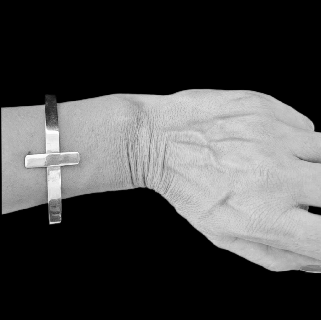 Pulsera esclava tipo cruz de 0,5 cm de ancho. Diámetro de 7 cm. Pieza realizada en plata baja. Diseñada y fabricada en Argentina.