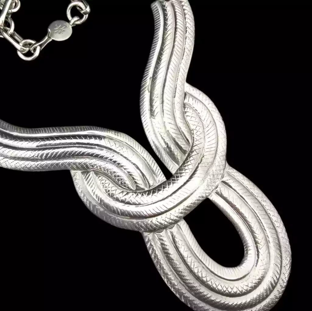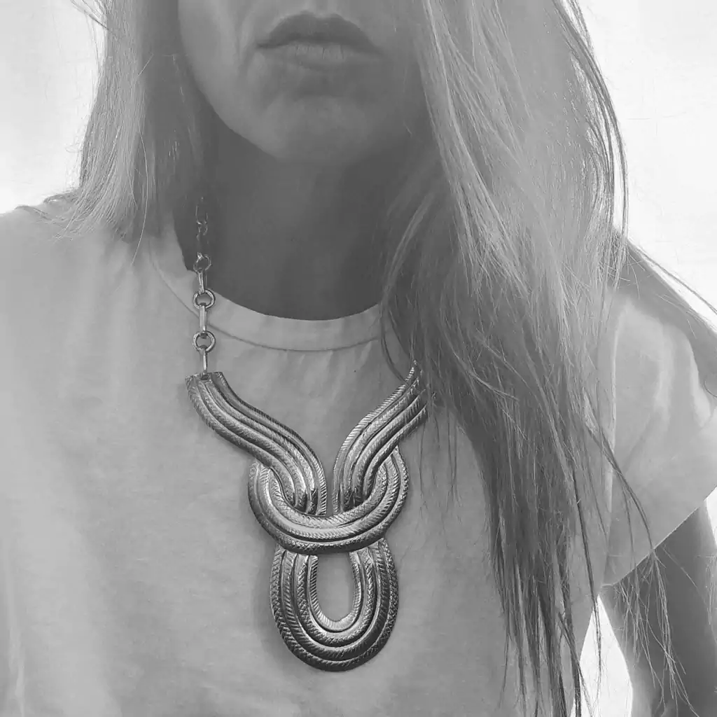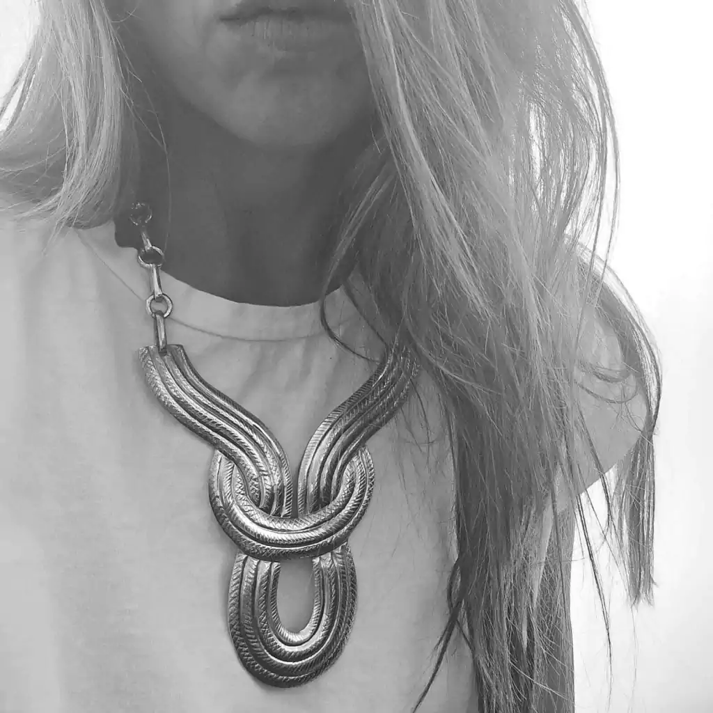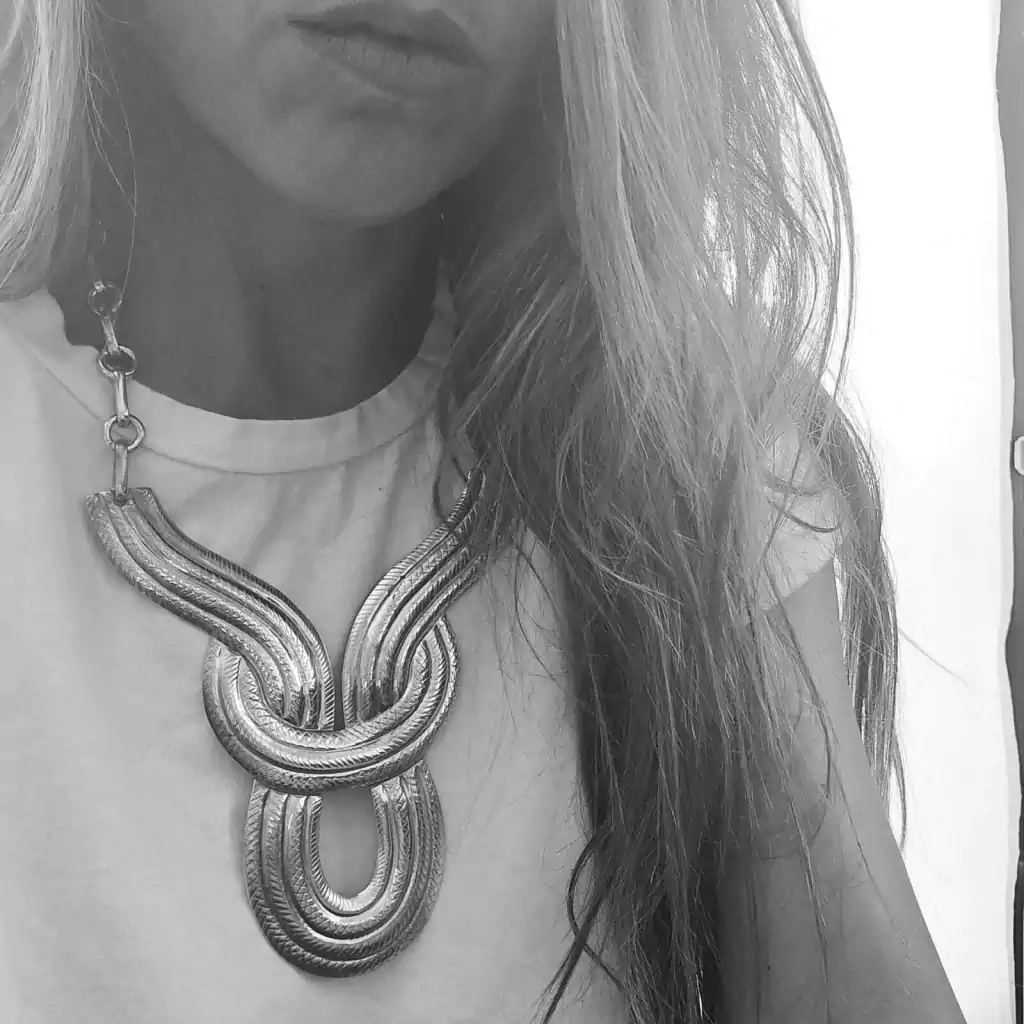 Importante collar tipo pectoral trabajado en alto y bajo relieve. Dije de 15 cm de largo y 13 cm de ancho. Collar de 45 cm. Pieza realizada en plata baja. Diseñada y fabricado en Argentina.
