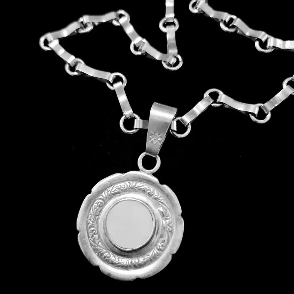 Collar compuesto por cadena realizada a mano de 48 cm de largo y especial dije circular cincelado con centro de resina vegetal color crudo engarzada. Diámetro del dije 4,5 cm. Largo total del dije 5,5 cm. Pieza de plata baja.