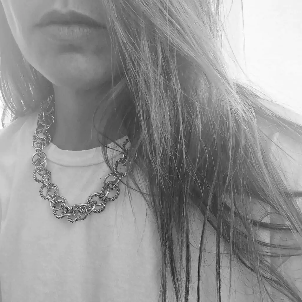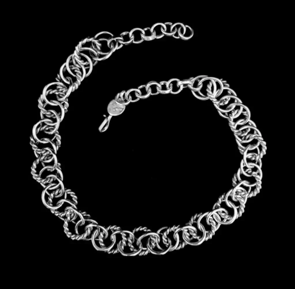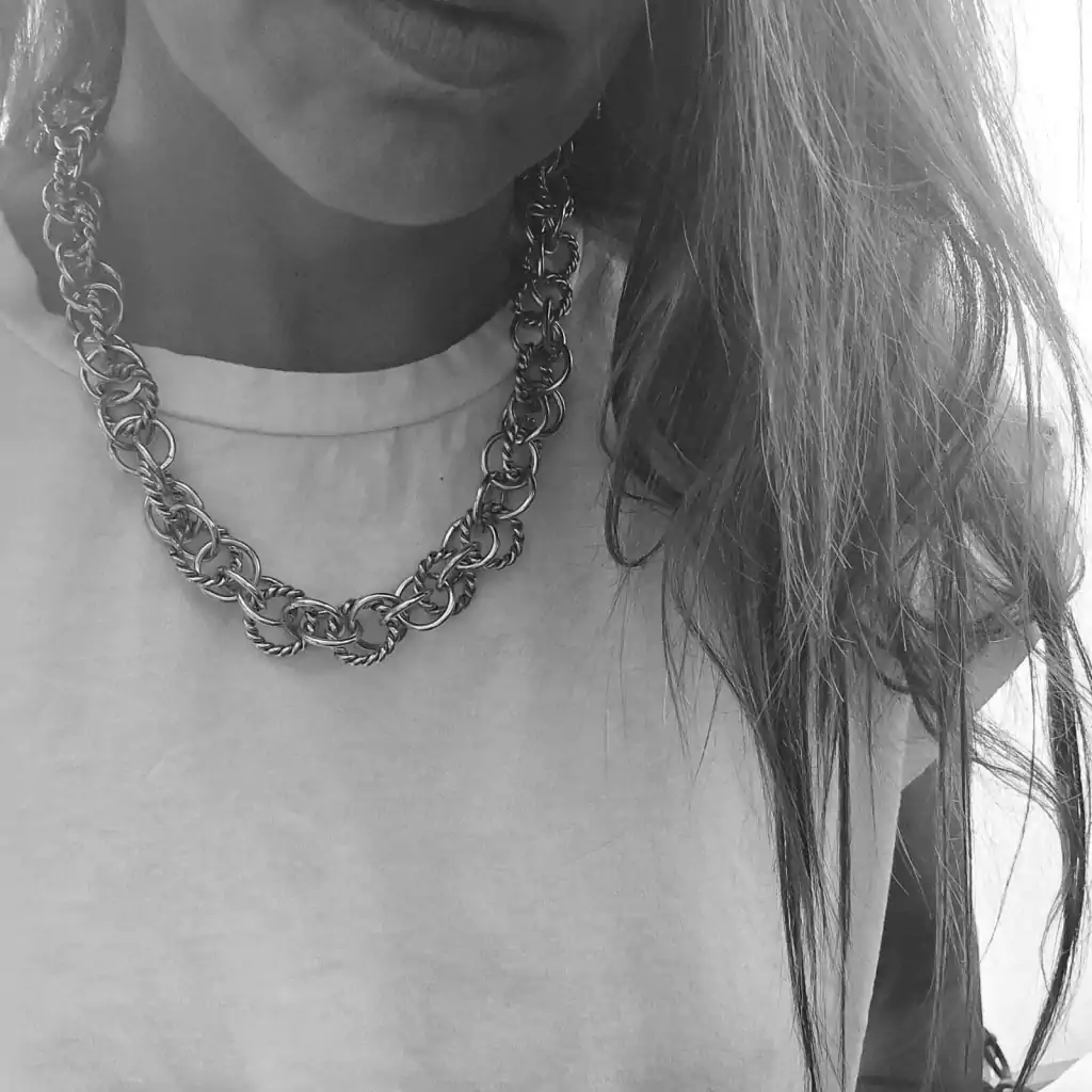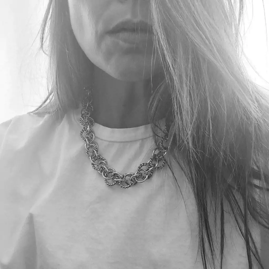 Especial collar realizado a mano de diferentes diseños de argollas todas entrelazadas. Largo de 46 cm. Pieza realizada en plata baja. Fabricado y diseñado en Argentina.