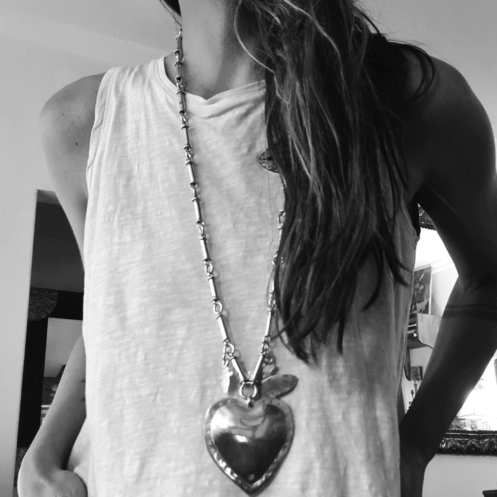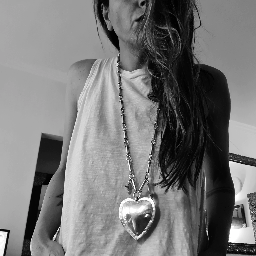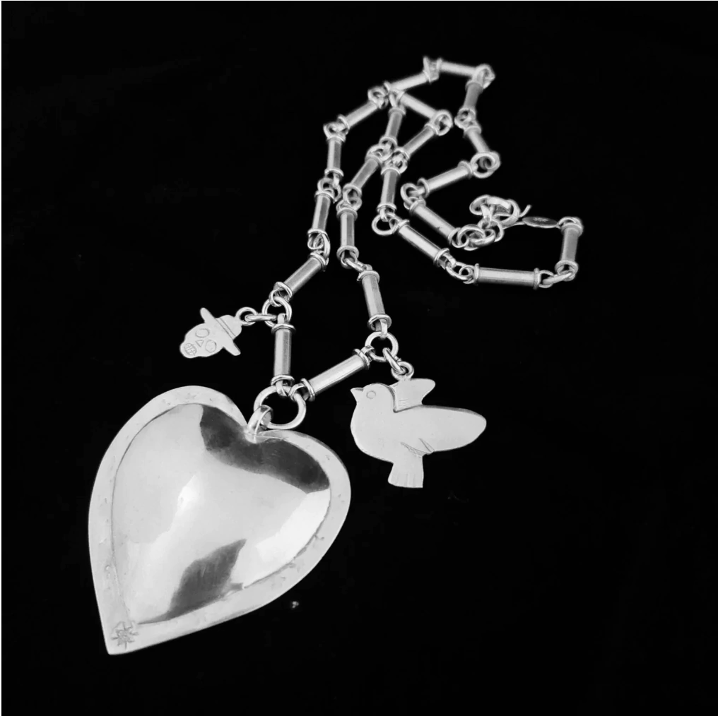 Importante collar de 70 cm de largo acompañado de dijes chicos de calavera (2 cm) y palomita (3,5 cm) Importante dije central de corazón de 7,5 cm. Pieza de plata baja. Diseñado y fabricado en Argentina.