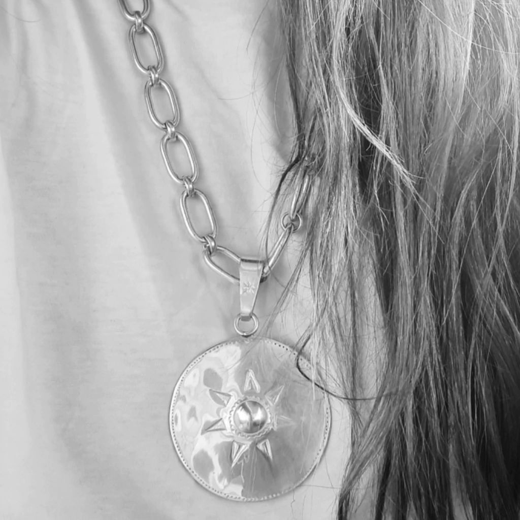 Collar compuesto por cadena realizada a mano de 60 cm de largo y especial dije con centro de sol cincelado. Diámetro del dije 6 cm. Pieza de plata baja. Fabricado y diseñado en Argentina.