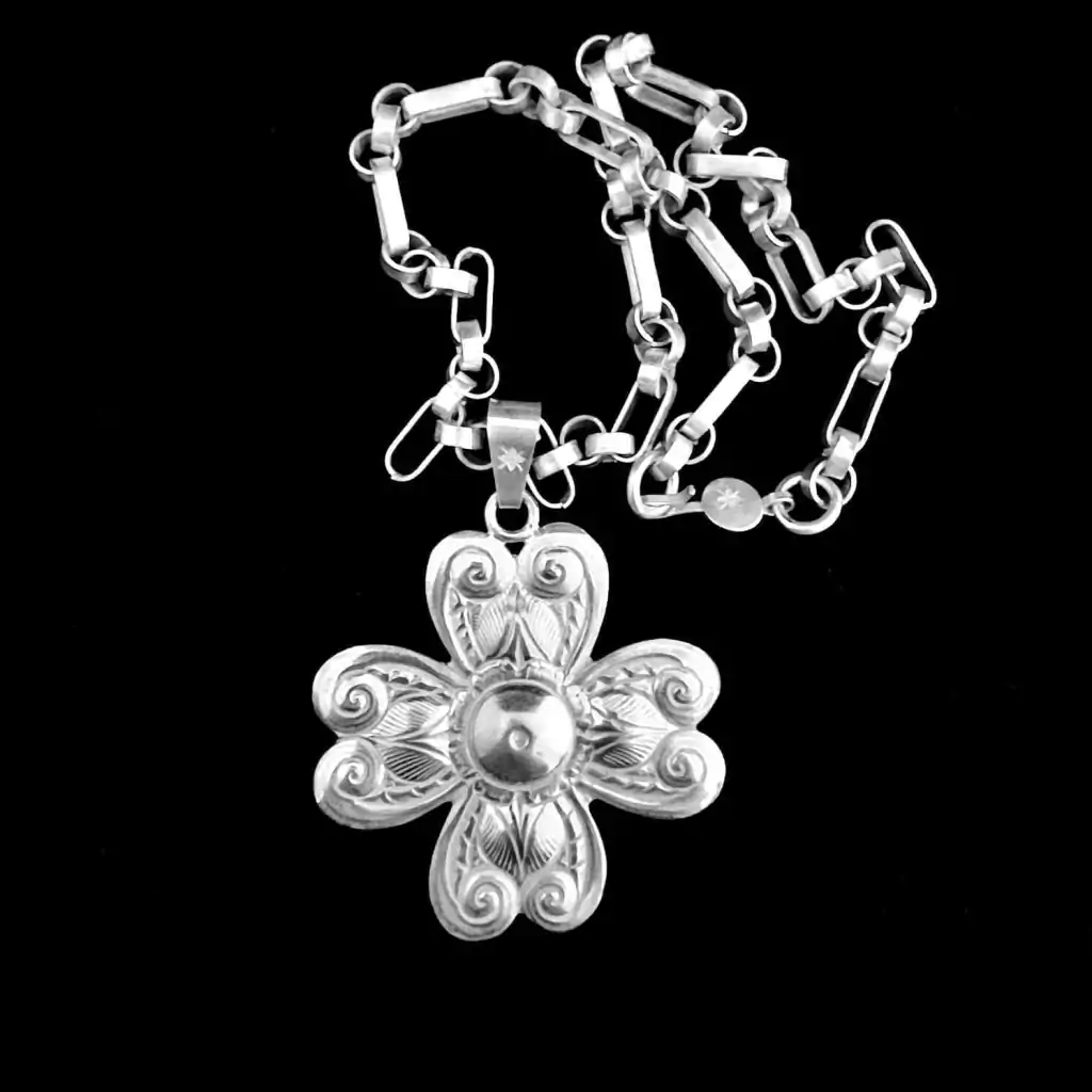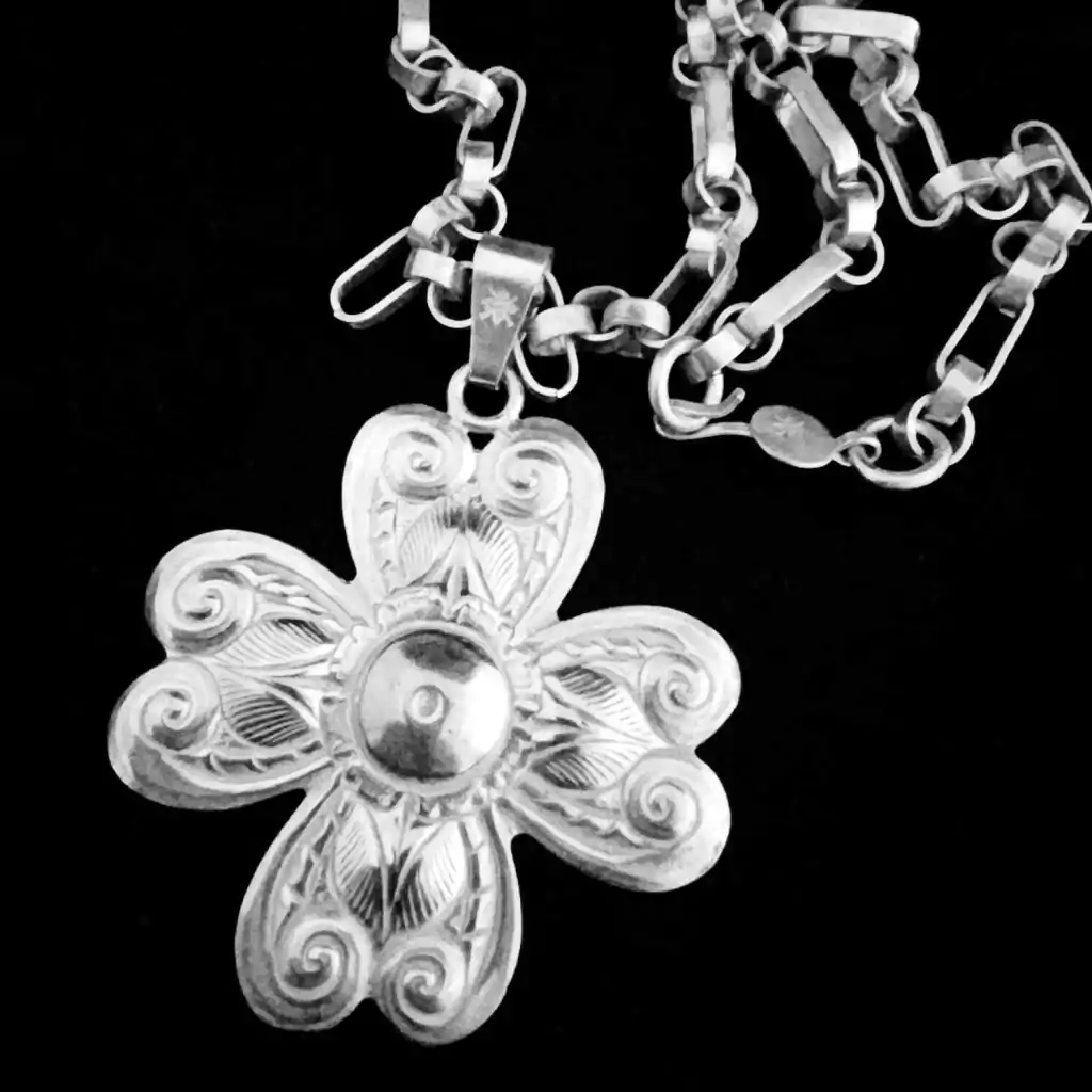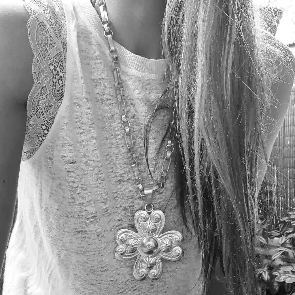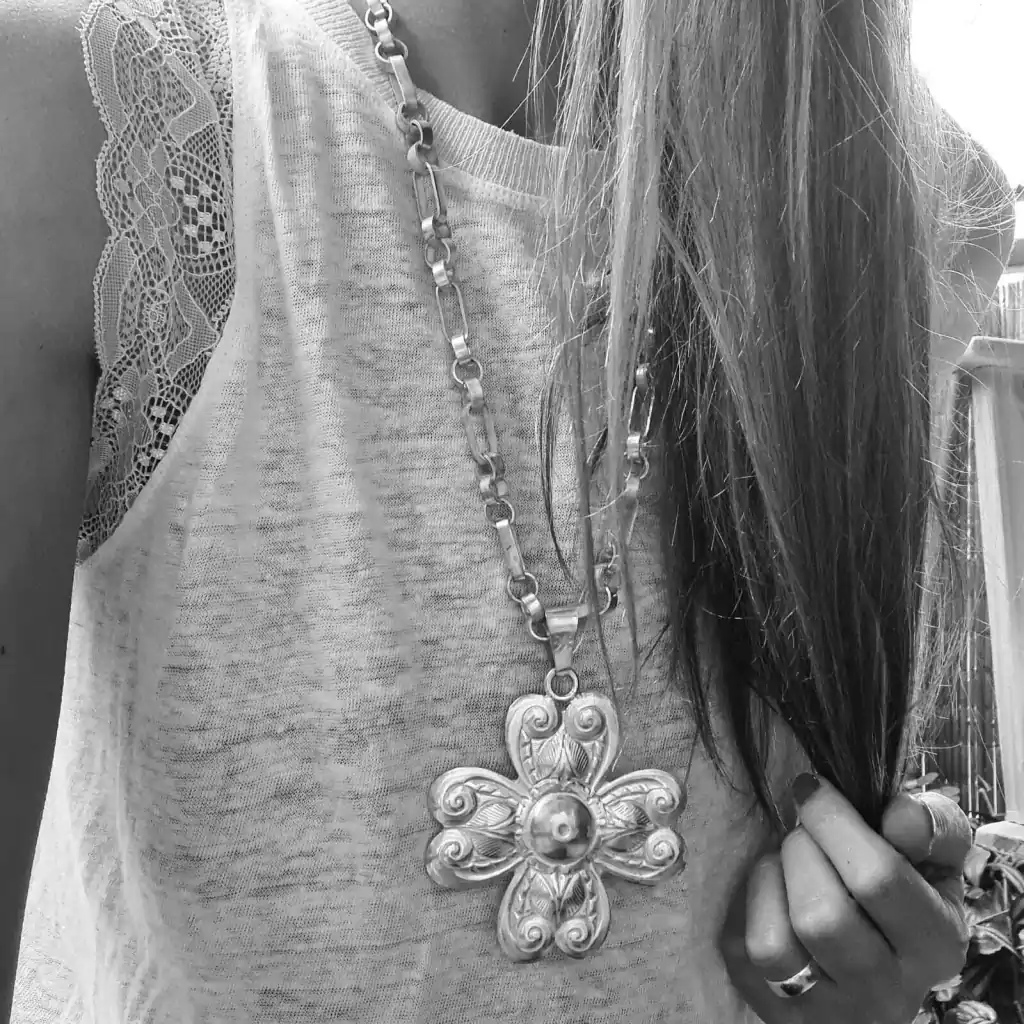 Collar compuesto por cadena realizada a mano de 63 cm de largo acompañada en gran dije de flor profundamente cincelada. Medida de la flor 8 cm por 8 cm. Largo total del dije 10cm. Fabricado y diseñado en Argentina.