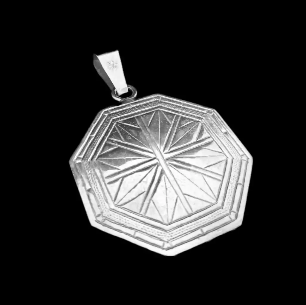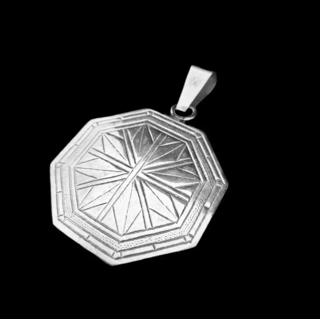 Especial dije octogonal de 6 cm x 6 cm trabajado a cincel. Pieza realizada en plata baja. Fabricado y diseñado en Argentina.