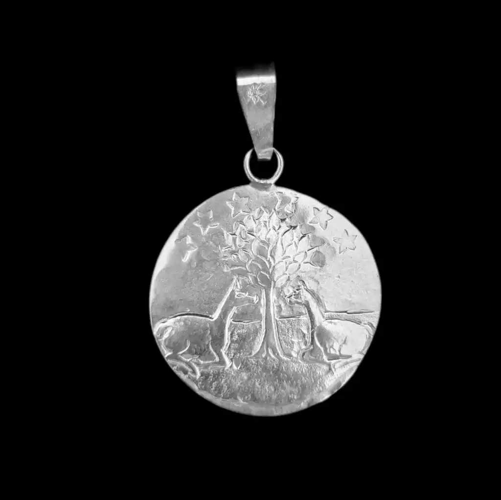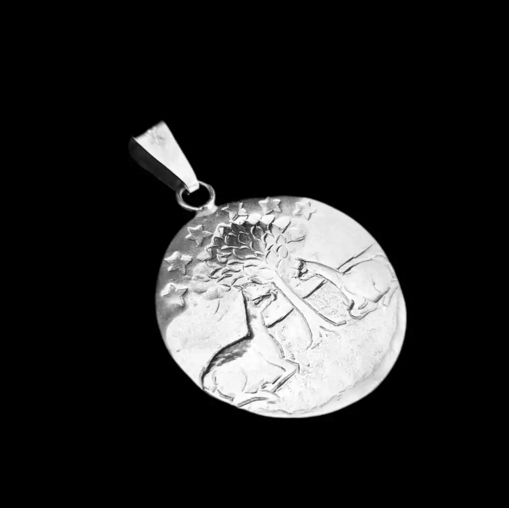 Especial dije trabajado en alto y bajo relieve del árbol de la vida. Diámetro del dije 6 cm. Pieza realizada en plata baja. Fabricado y diseñado en Argentina.