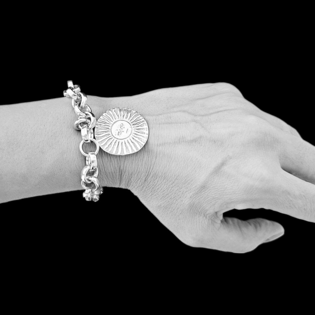 Pulsera articulada de 23 cm de largo y aplique del sol Inti trabajado en alto y bajo relieve. Diámetro del dije 3 cm. Cierre regulable. Pieza realizada en plata baja. Diseñada y fabricada en Argentina.