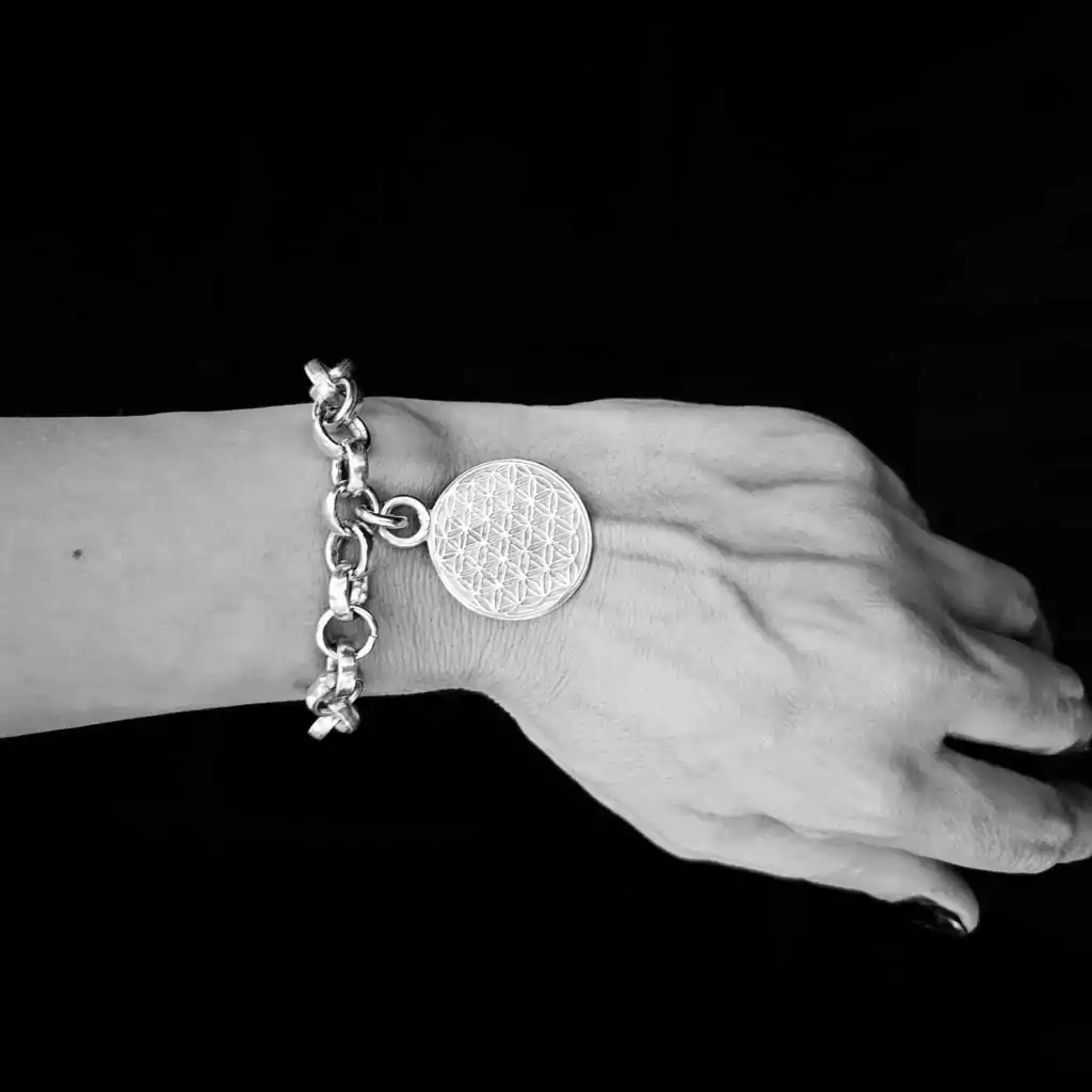 Pulsera articulada de 23 cm de largo y dije circular trabajado el alto y bajo relieve de 2,7 cm de diámetro. Pieza realizada en plata baja. Tupambae: Tierra de Dios (Guaraní)