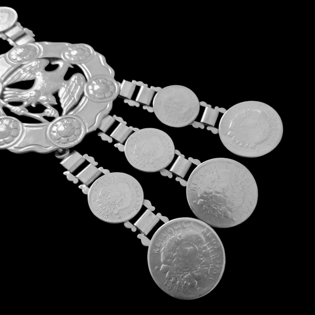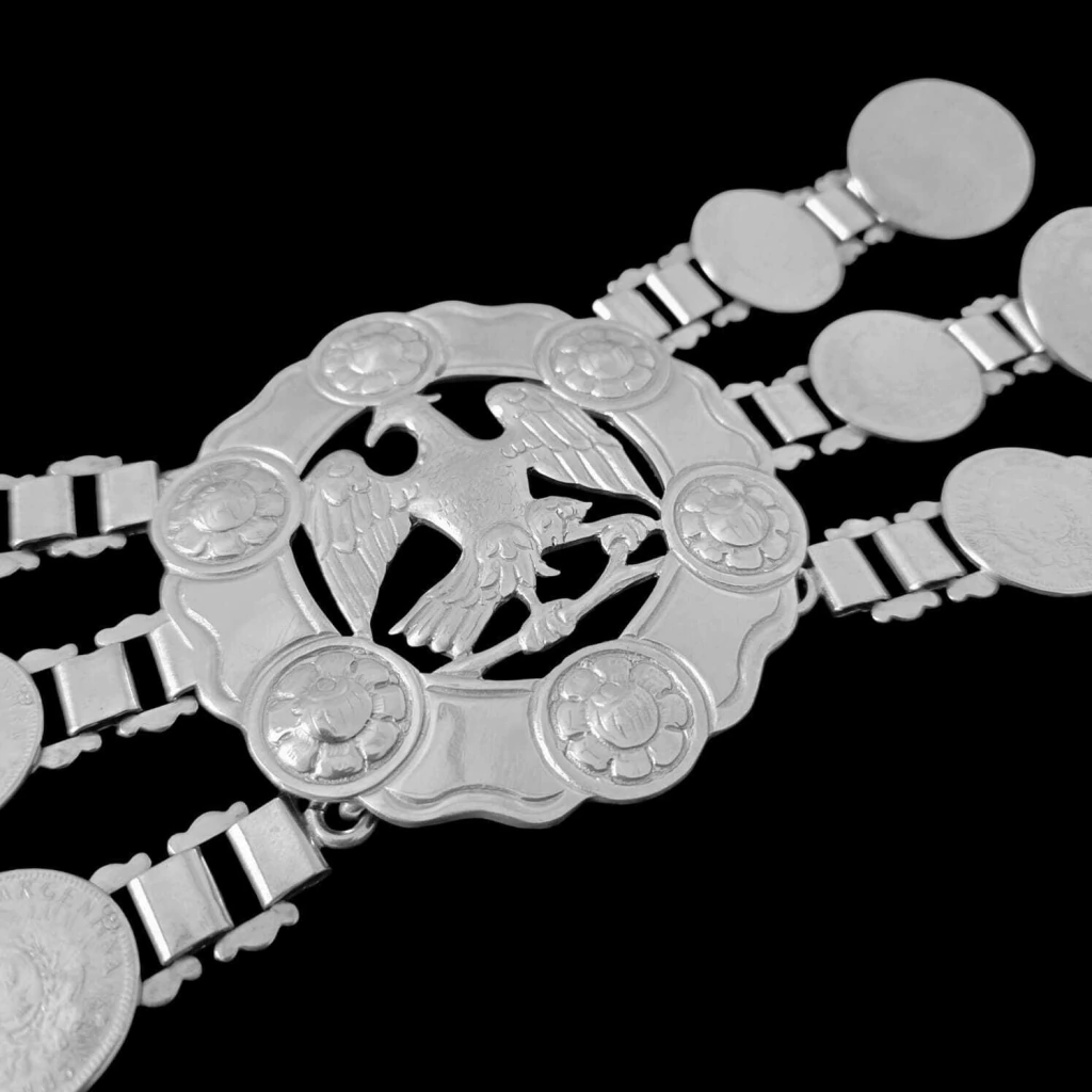 Especial rastra con centro de águila calada y trabajada en alto y bajo relieve de 10 cm de diámetro y tiros de canevones chatos (2 cm de ancho) intervenido con medios patacones/ carolos (3 cm de diámetro) y patacones/carolos (4 cm de diámetro). Largo total de 30 cm. Pieza realizada en plata baja. Diseñada y fabricada en Argentina.