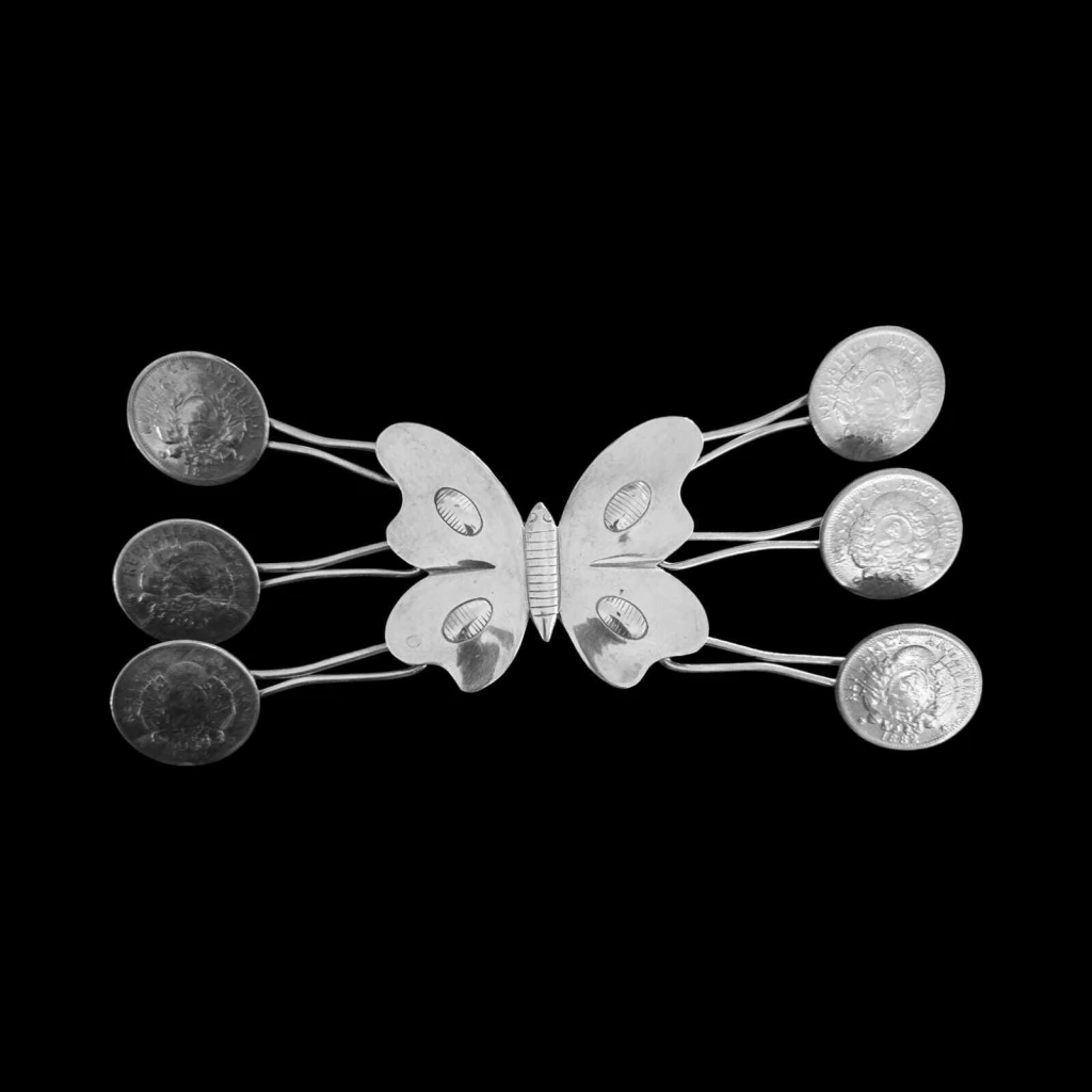 Especial rastra con centro de mariposa trabajada a cincel de 9 cm x 8 cm y tiros de alambre con monedas de carolos o patacones. Largo total de 24 cm. Pieza realizada en plata baja. Diseñada y fabricada en Argentina.