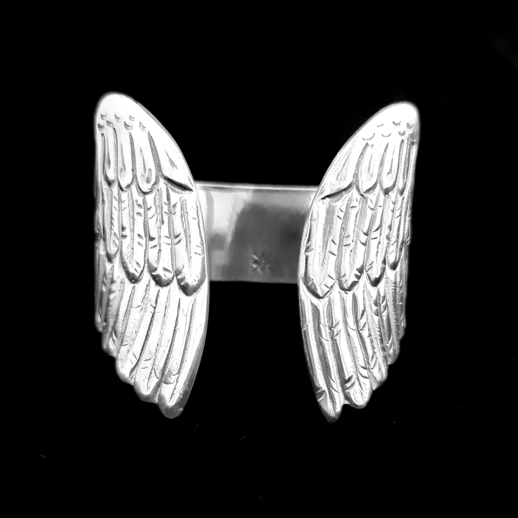Special open bangle with details of chiseled wings. Maximum width of 6 cm. Piece made in silver alloy. Made in Argentina.