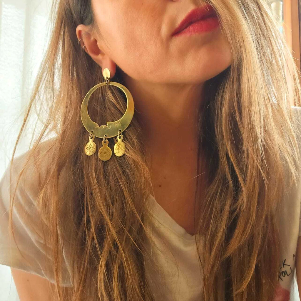 Pair of large earrings in the shape of a chiseled and cut-out moon with dangling teardrops, inspired by Mapuche design. Total length: 9 cm. Diameter: 6 cm. Piece made of bronze. Designed and manufactured in Argentina.