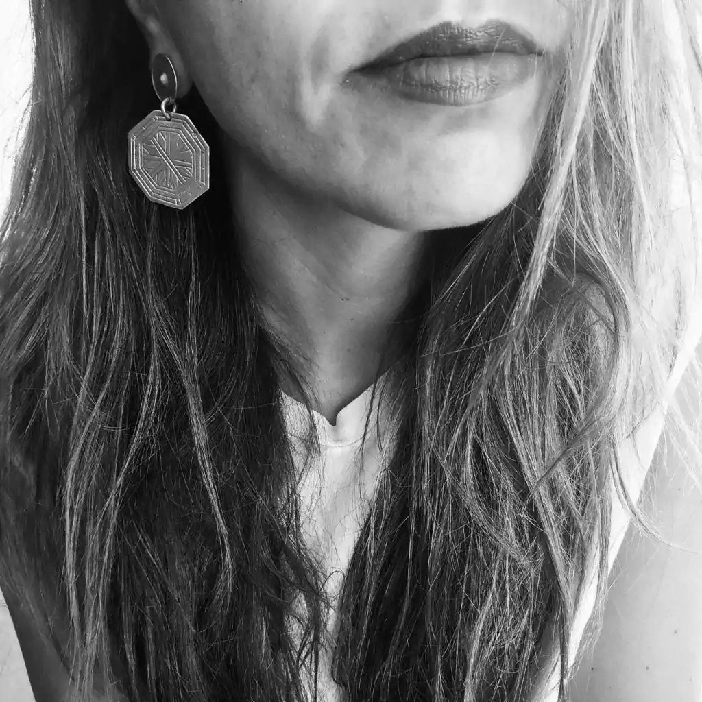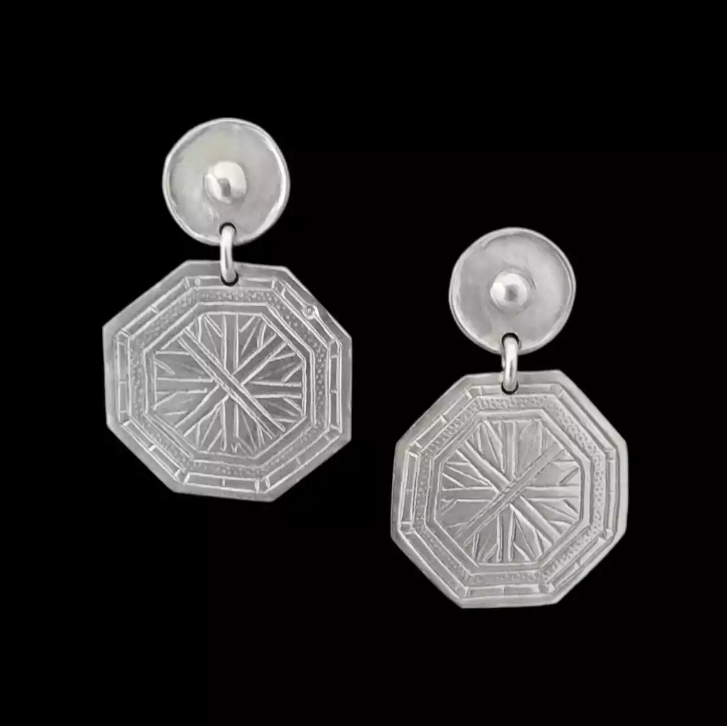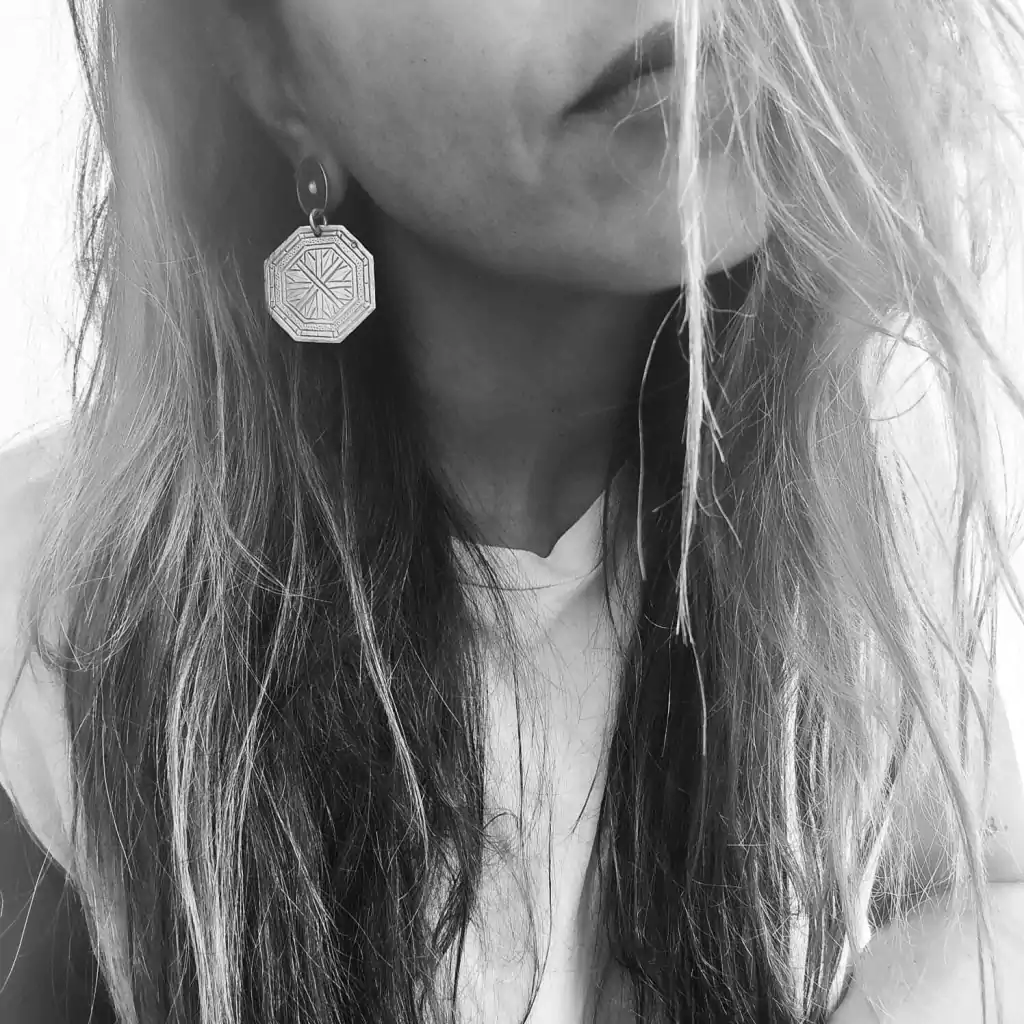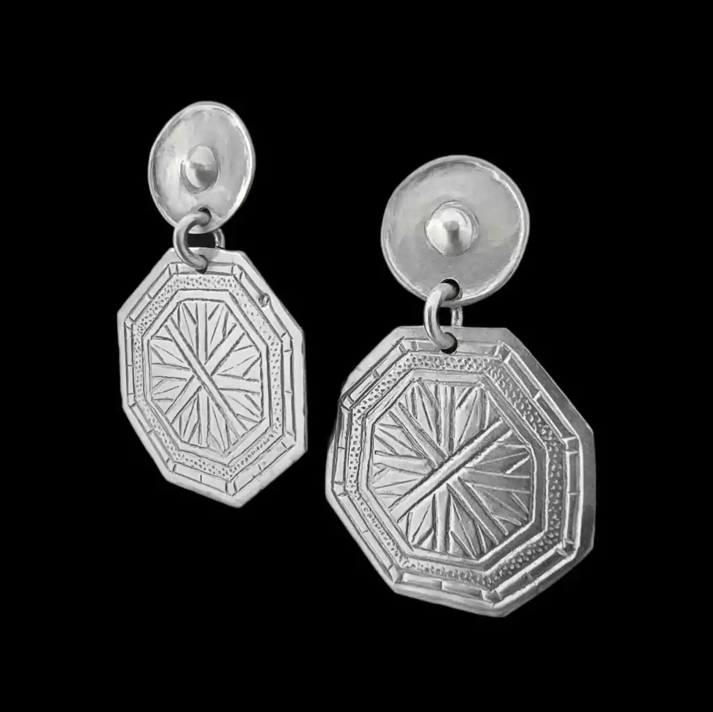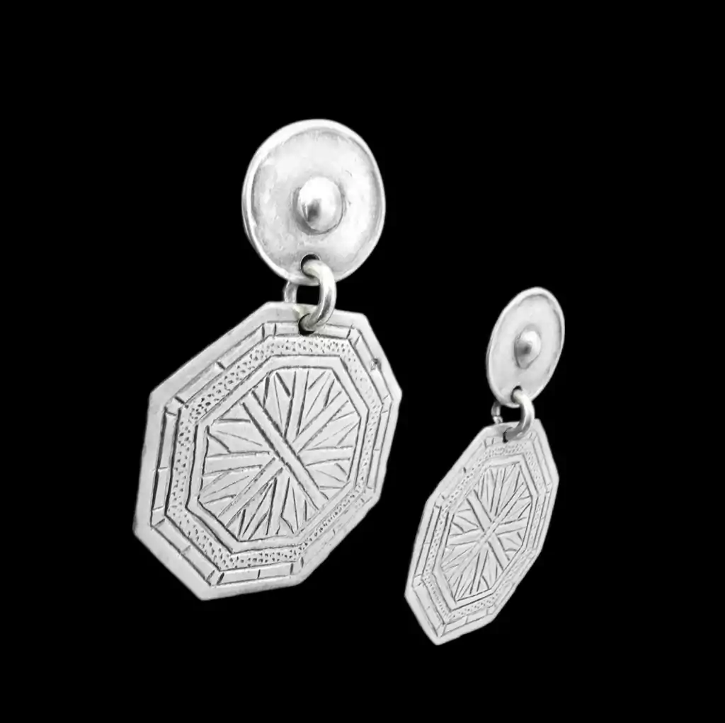 Special pair of medium-sized earrings with a 3.5 cm x 3.5 cm chiseled octagonal pendant. Lobe diameter 1.5 cm. Total length 5 cm. Silver alloy earrings. Made in Argentina.