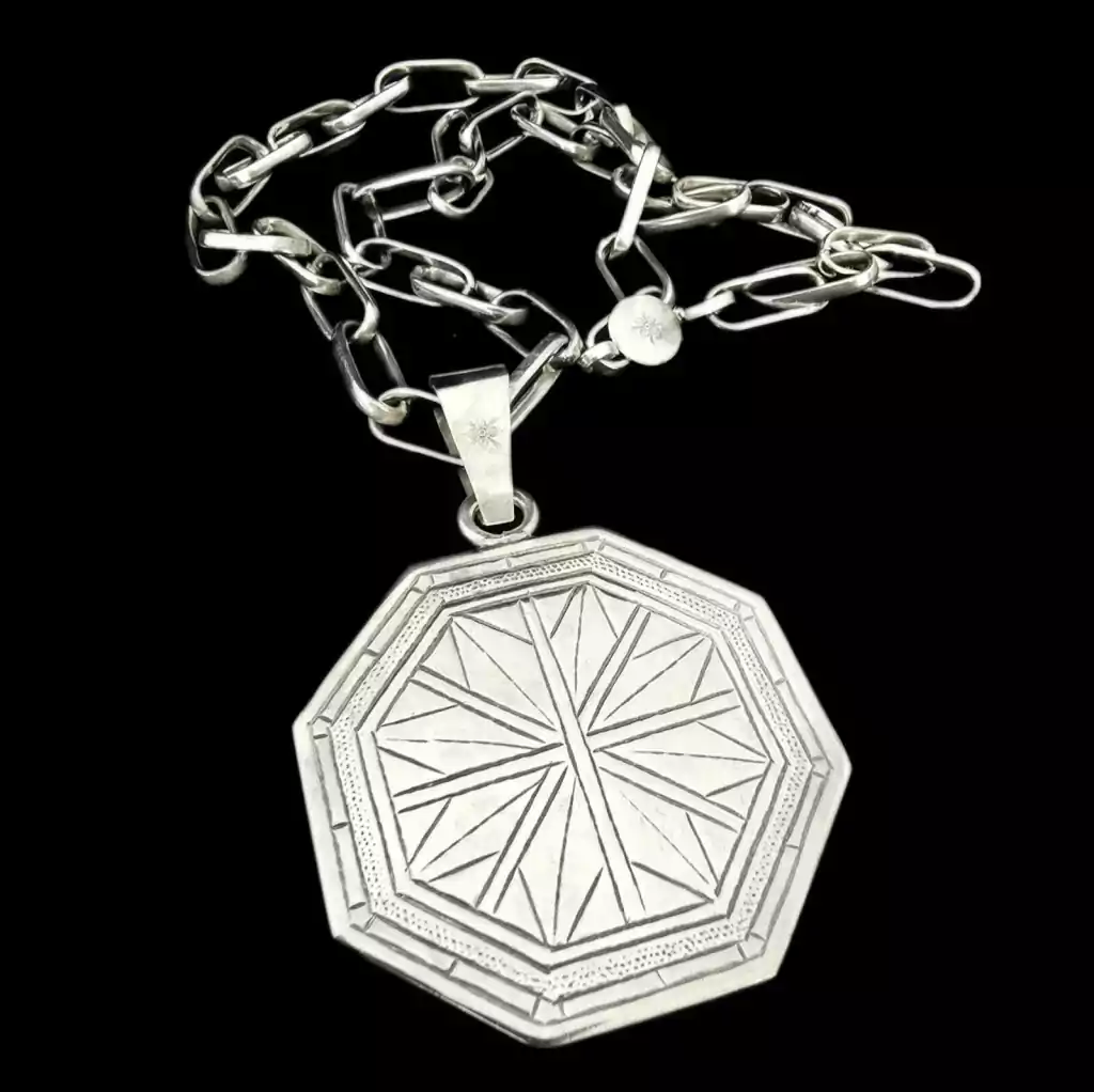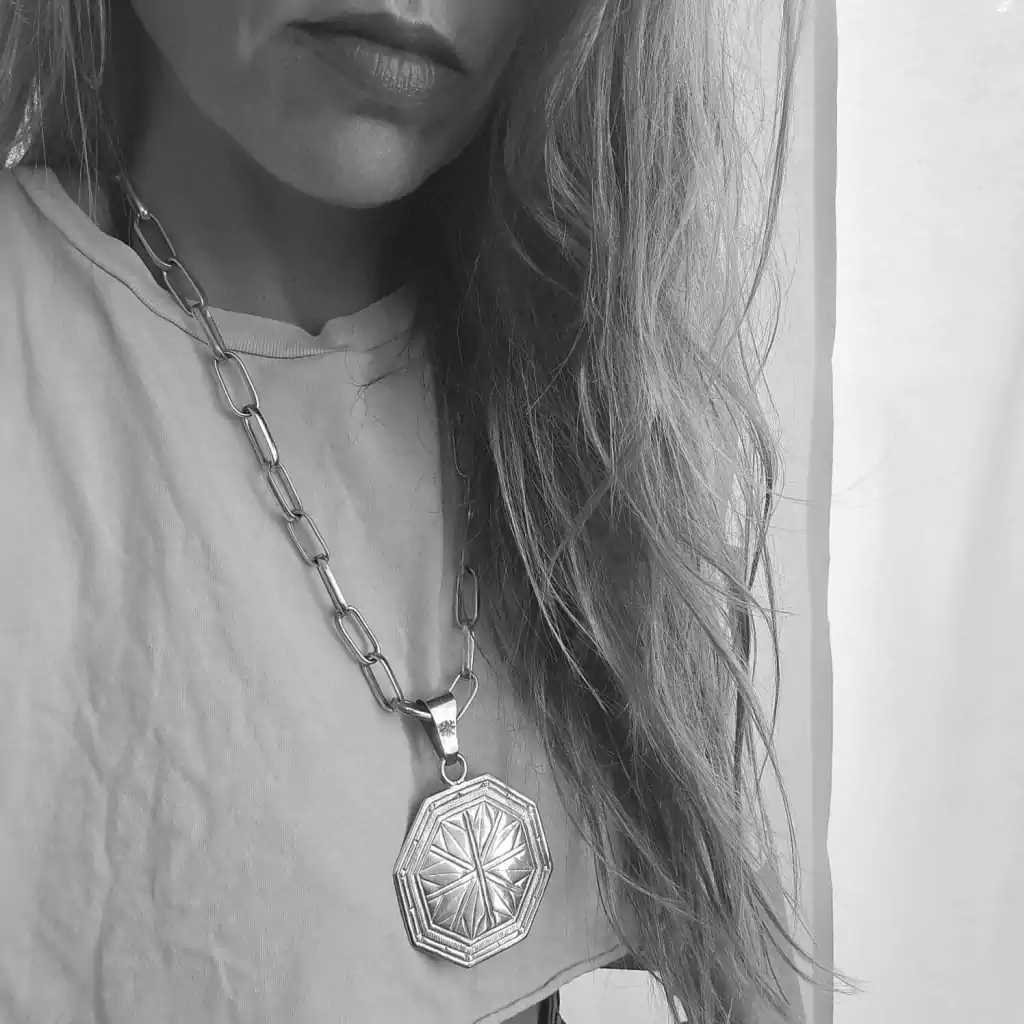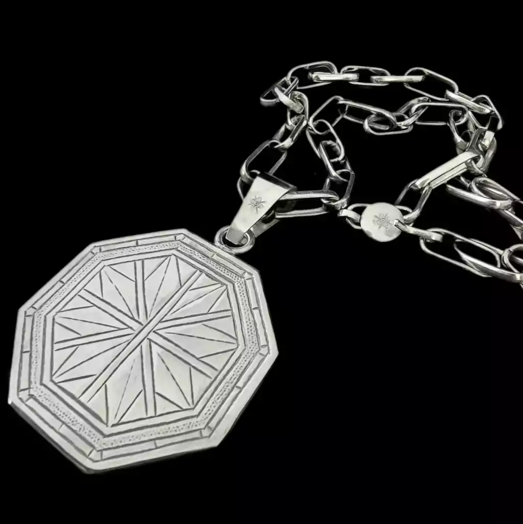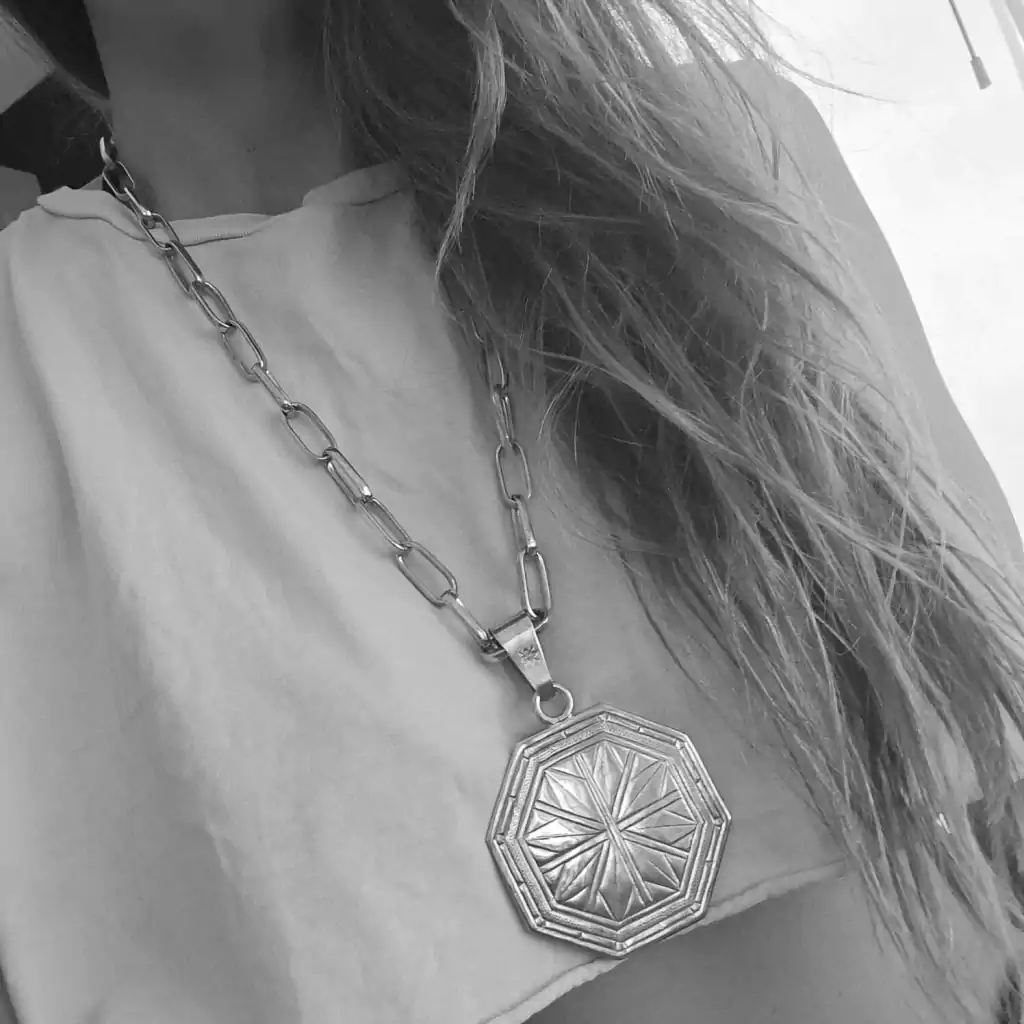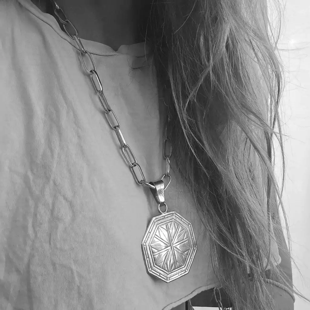 Special necklace composed of a 70 cm long handmade chain and a special 6 cm x 6 cm octagonal chiseled charm. Piece made of silver alloy. Made and designed in Argentina.