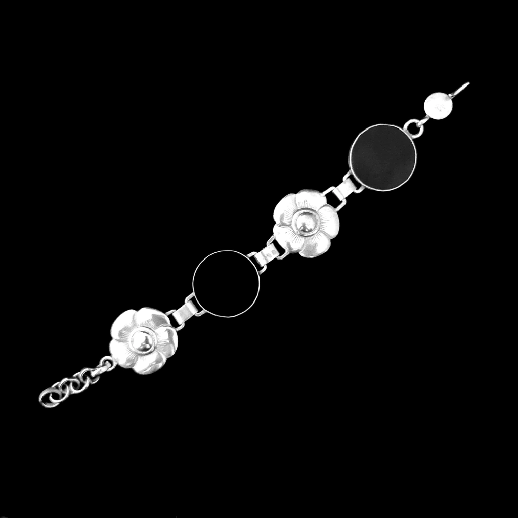 Special 23 cm long bracelet with pansy flowers crafted in high and low relief and set with black-colored vegetable resin. 3 cm diameter. Piece made of silver alloy. Made and designed in Argentina.