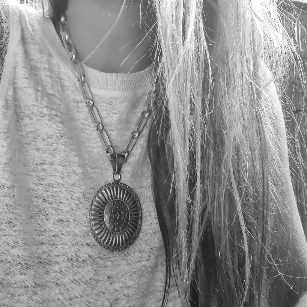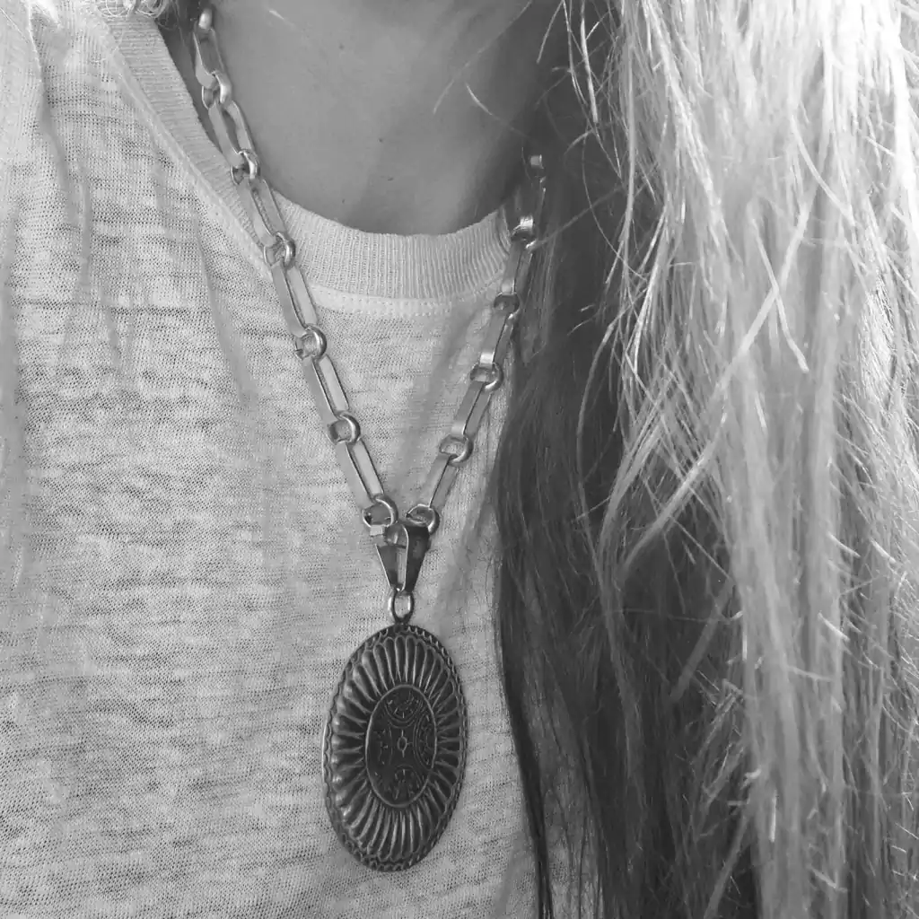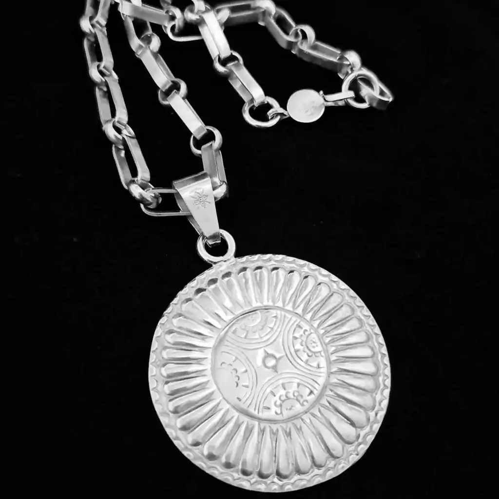 Necklace made up of a 45cm long handmade chain and a special Mapuche-inspired circular pendant worked in high and low relief. Piece made in silver alloy.